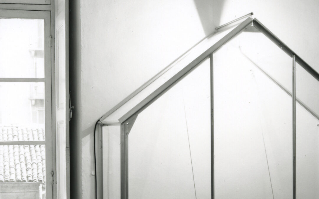 The first work in the exhibition is a historical work, a suspended glass and iron ‘interior’. In this visual contrast between lightness and hardness, a life-bearing blade of light breaks through, charging the work with hope: hope that something can still be born in a place where there is no life.