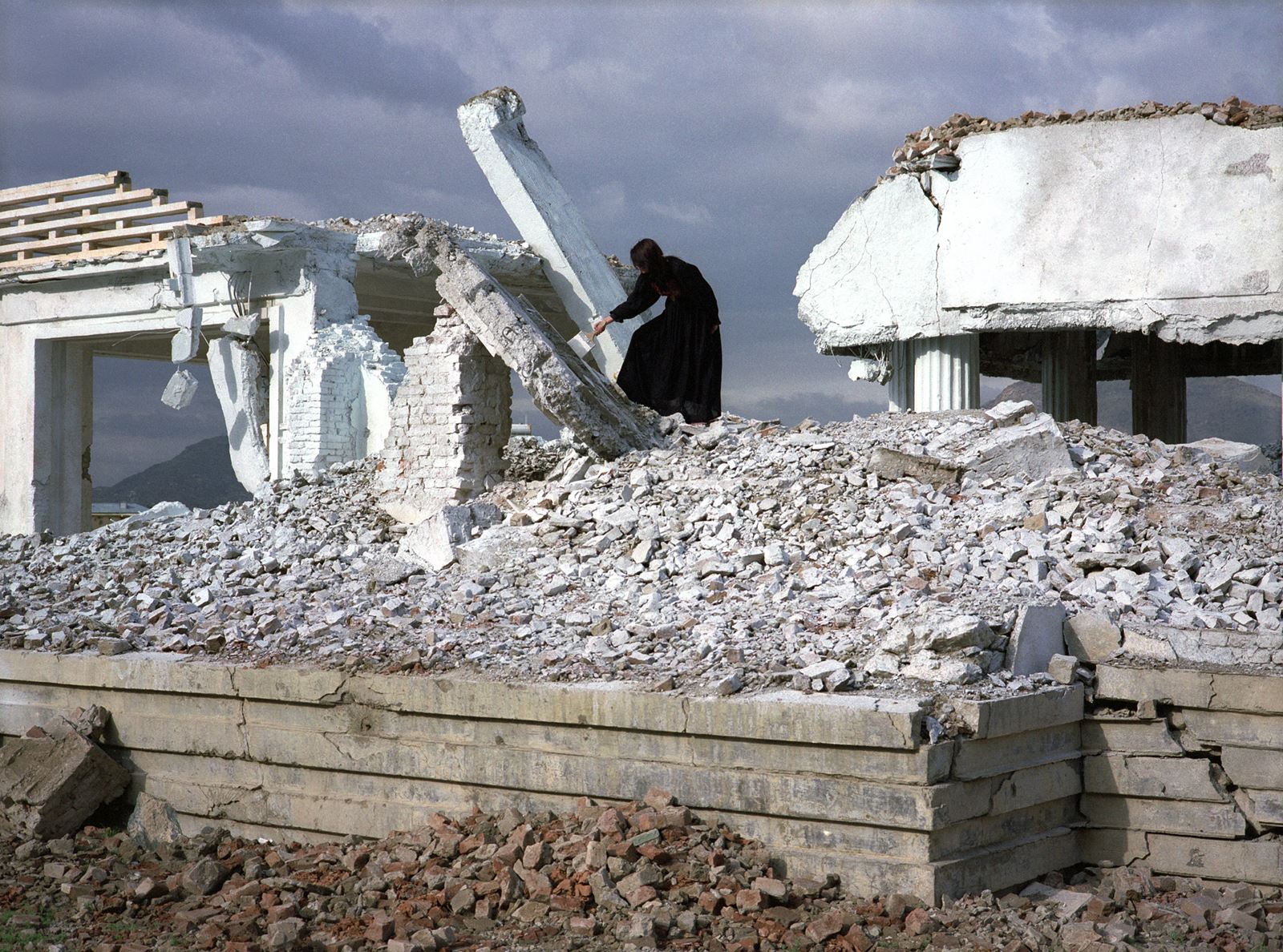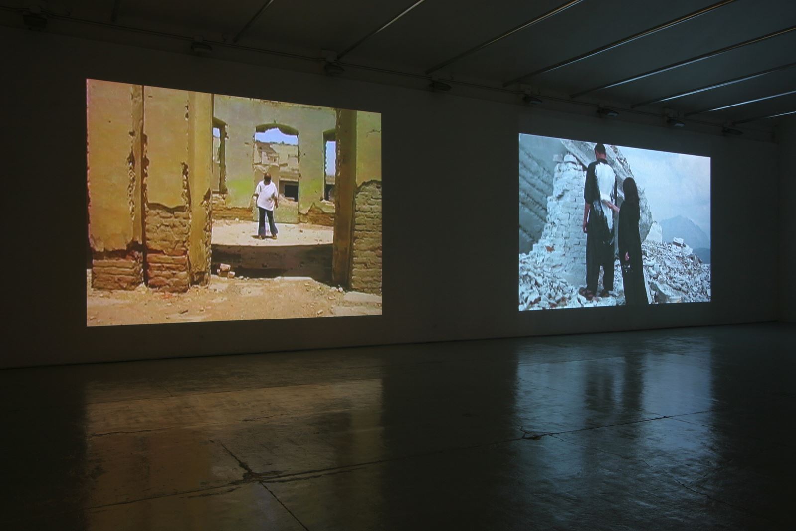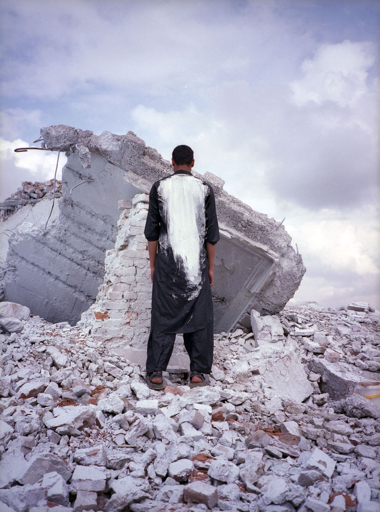 White House represents a government building that was knocked down by a US air strike. Only a few columns (it was a neoclassical style construction) and a few walls of the building stand in their original vertical condition, all the rest has been reduced to rubble. Lida Abdul reflects on the representation of ruin or the subsequent significance and fate of sites of catastrophe, death and memorial.
