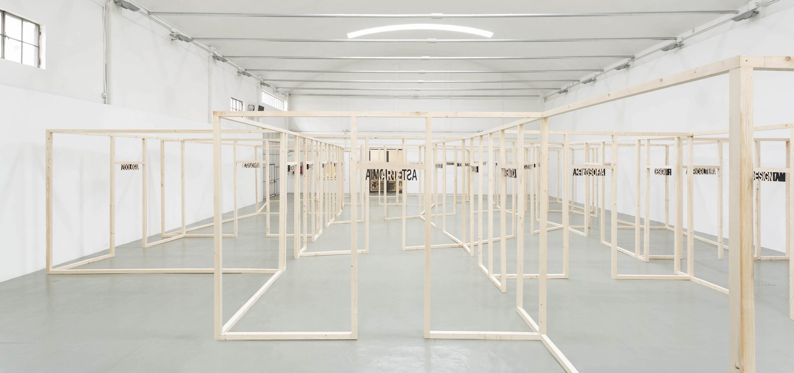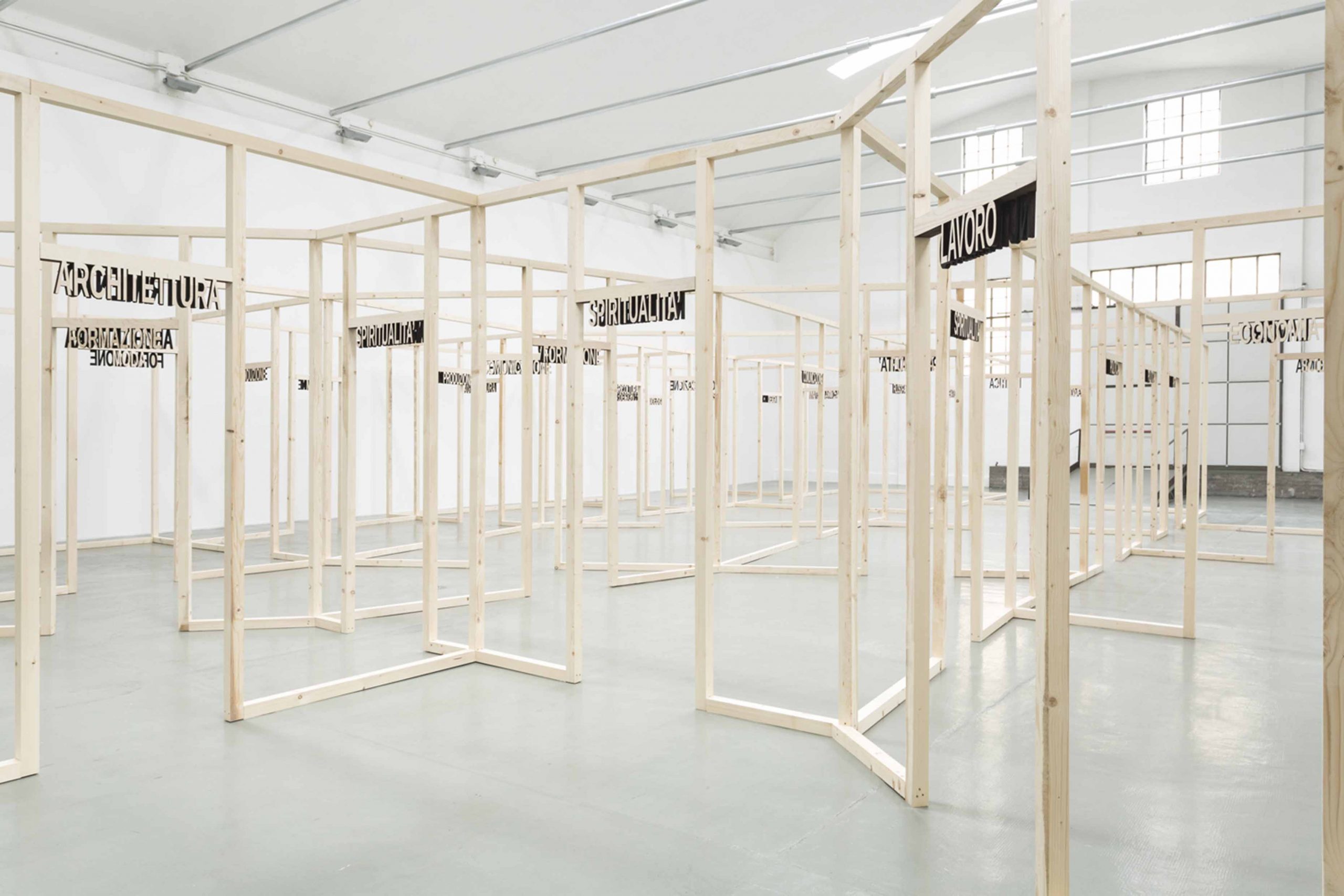 The installation in via Principessa Clotilde is a tribute to human industriousness and marks a strong declaration of intent by Pistoletto. A rough wooden structure is shaped to form seventeen open spaces, named after the different sectors of the social structure. These cells, although independent, are part of a single organism and, interconnected, make up the system that links art and society.