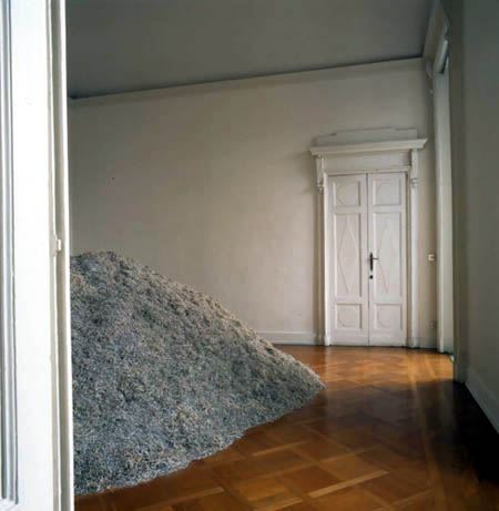 In The Zero Point of Literature that consists of a voluminous heap of shredded printed paper occupying the entire third room of the gallery, Mali Wu wants to express and represent, in the tactile and indetermined visibility of a great accumulation of atomised literature, ‘the planetary horizon’ where indeed the relationships of interaction and retroaction, as global elements, are indissolubly linked together.