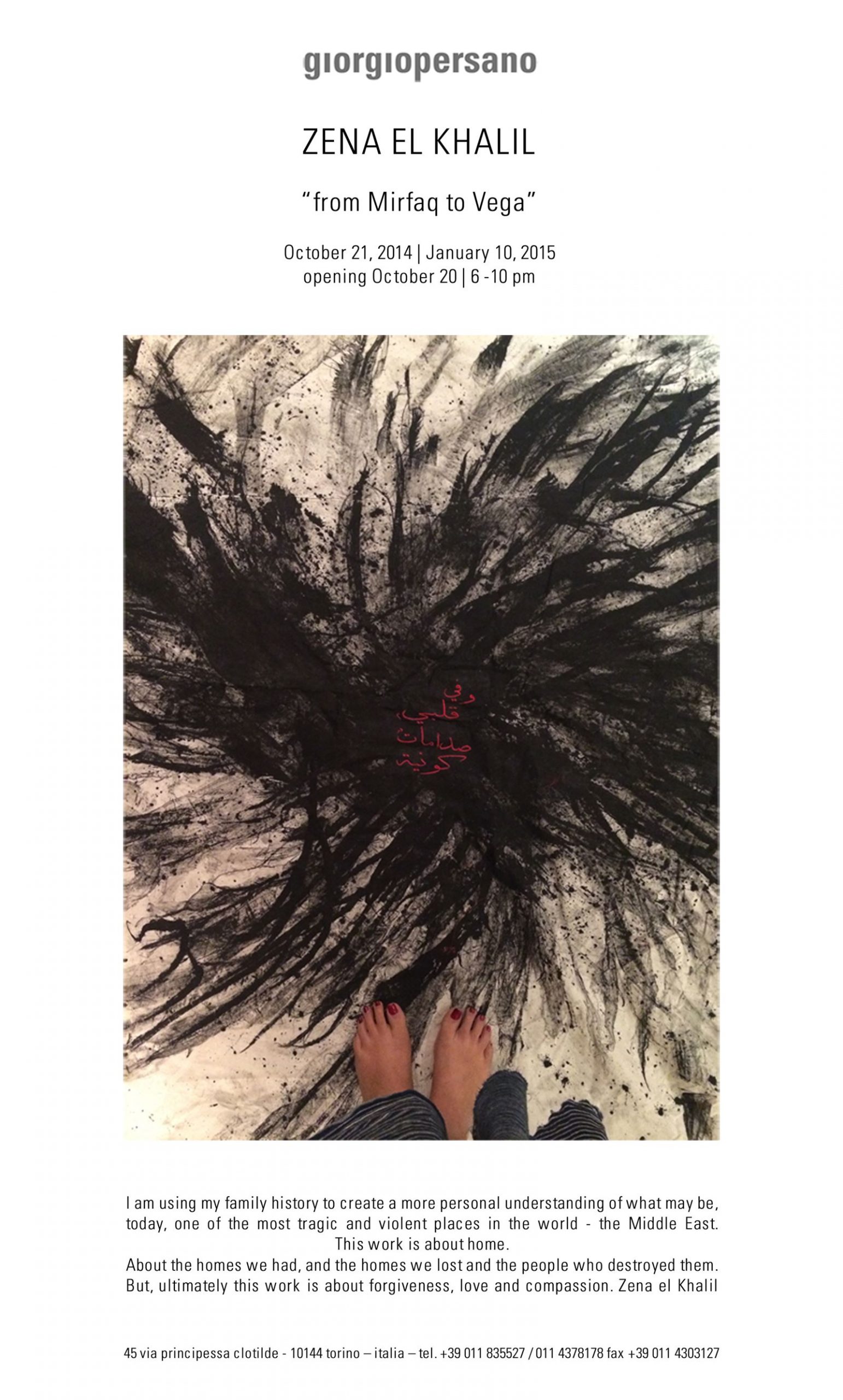 From October 21, 2014 until January 10, 2015 Giorgio Persano gallery presents from Mirfaq to Vega, a solo exhibition by the Lebanese artist Zena el Khalil (b. 1976). Versatile cultural agitator based in Beirut, during the 2006 invasion of Lebanon, she was one of the first largely followed Middle Eastern bloggers; her book, Beirut, I Love You, is translated into several languages. In 2012 she was made a TED Fellow. Today, in this exhibition she presents a new and complex project.