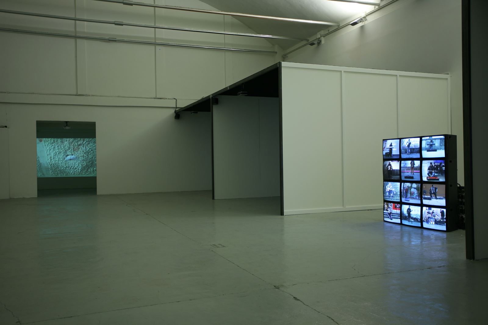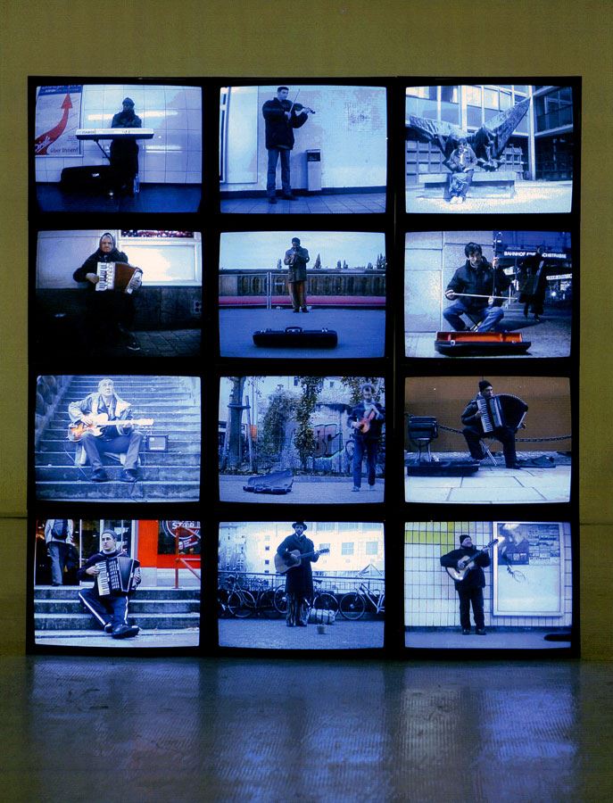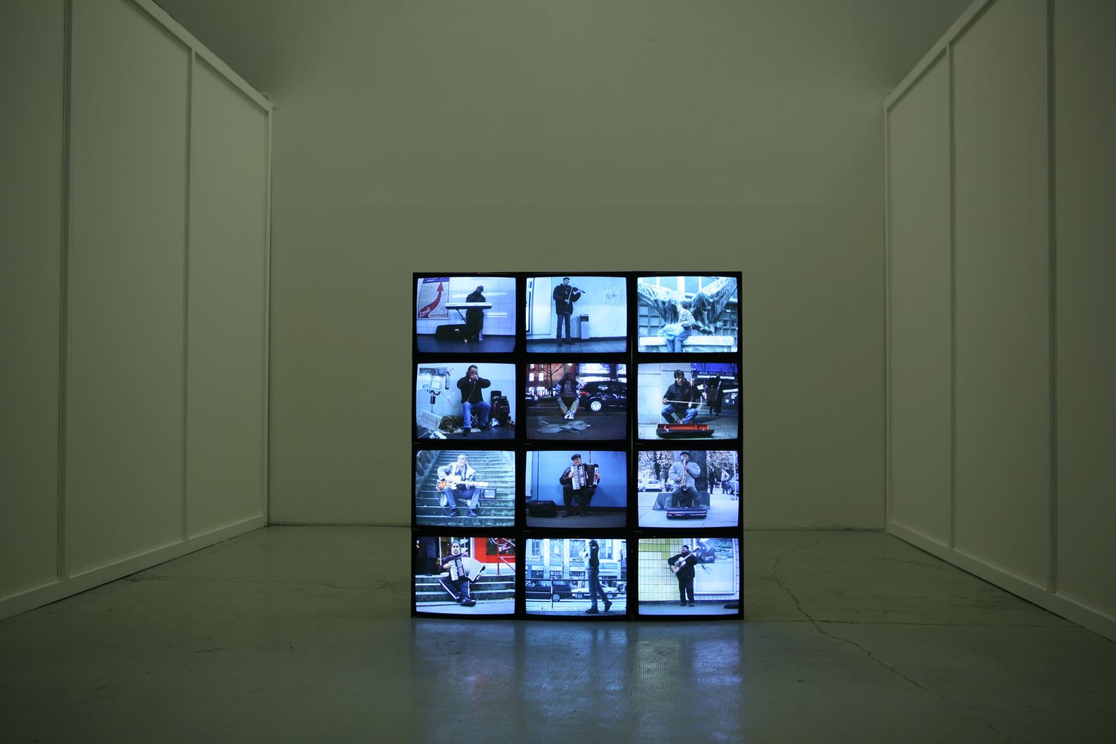 Di coesistenza tra uomini integrati nella società ed altri che ne sono ai limiti parlano anche i lavori dell’artista tedesco Ulf Aminde. I protagonisti delle sue opere sono infatti quei personaggi esclusi dalla società come punk, alcolizzati, senzatetto, suonatori di strada. Sono le persone che giocano ruoli fondamentali in molti suoi lavori e anche in Life in not a listeners requests program (2006), il video in mostra. 12 schermi su cui girano in loop 24 filmati di altrettanti musicisti di strada a cui l’artista ha chiesto di suonare un’unica nota ripetitiva. Ne esce una cacofonia che sembra sonorizzare la vita sociale contemporanea, dove le comunità sono composte da singole individualità che non riuscendo più a coesistere suonano ciascuno la propria nota non curandosi degli altri suonatori.