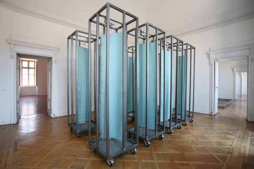 Le opere, nel loro muto dialogare, si richiamano con suoni liquidi e meccanici; attirano il visitatore verso la loro oggettiva persistenza di produzioni intensive di caos controllato; affascinanti macchine celibi, sono processi costruttivi sorvegliati da sistemi elettronici che generano variazioni continue, programmaticamente casuali. L’opera “Conversazione” del 2007 è percorsa da una leggera brezza; da un mormorio elettrico interrotto da brevi pause, come un respiro trattenuto tra rigidi scheletri di ferro. Una seta azzurro acquamarina gira su se stessa, si avvolge non curante intorno alla rigida struttura metallica, è un’anima imprigionata in un infinito dialogo tra identità fluide che tentano inutilmente di unirsi, di stare vicino.