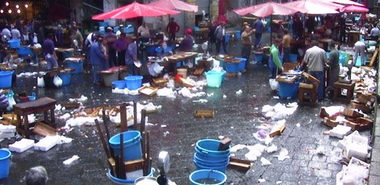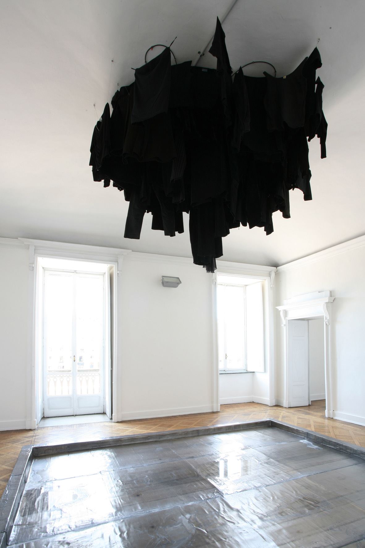 Lo stesso esercizio privato, lo stesso tentativo di relazione diventa pubblico in “Nuvola nera (das Fest)” opera, anch’essa del 2007, in cui un gruppo di donne in abiti da sera si ritrova per conversare. Su i loro abiti, l’odore della pelle rimane fissato. Solo attraverso una specie di operazione alchemica sarà possibile recuperare l’essenza di quell’odore, di quell’anima. L’acqua piovana attraverserà i corpi, laverà le vesti e, raccolta in una grande vasca di argenteo piombo vellutato, conserverà la memoria nella sua traccia di sedimentazione calcarea. Un legame ancora più intenso lo ritroviamo in “Alta marea”, “Bassa marea” e “Torino”, tutte opere recentissime del 2007, che segnano un legame dell’artista con l’Italia e in particolare con il mare e la chiassosità dei suoi mercati. Chi proviene dalla direzione nord dell’autostrada A26 verso Genova, sa che ad un certo punto sul passo del Turchino, alla fine di una lunga discesa e dopo una curva, vede finalmente il mare.