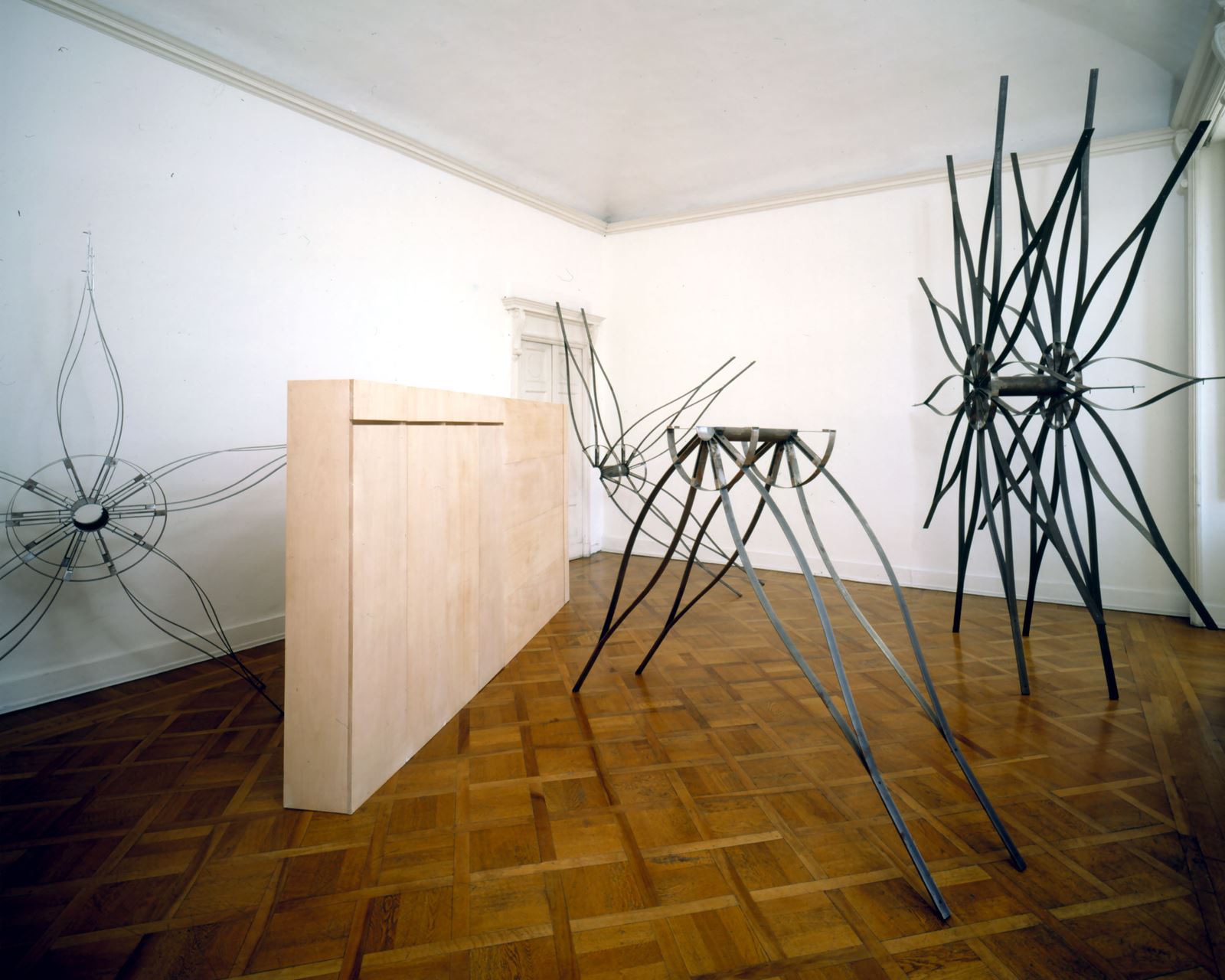 Ecco dunque presentarsi nelle sale la sequenza del  motivo floreale di grandi dimensioni che  si espande secondo ritmi moltiplicati aldilà della sua mera rappresentazione e, a suo complemento, il volume delle casse in legno le cui fessure creano altrettanti “alter ego” del nostro sguardo, moltiplicando i punti di fuga.