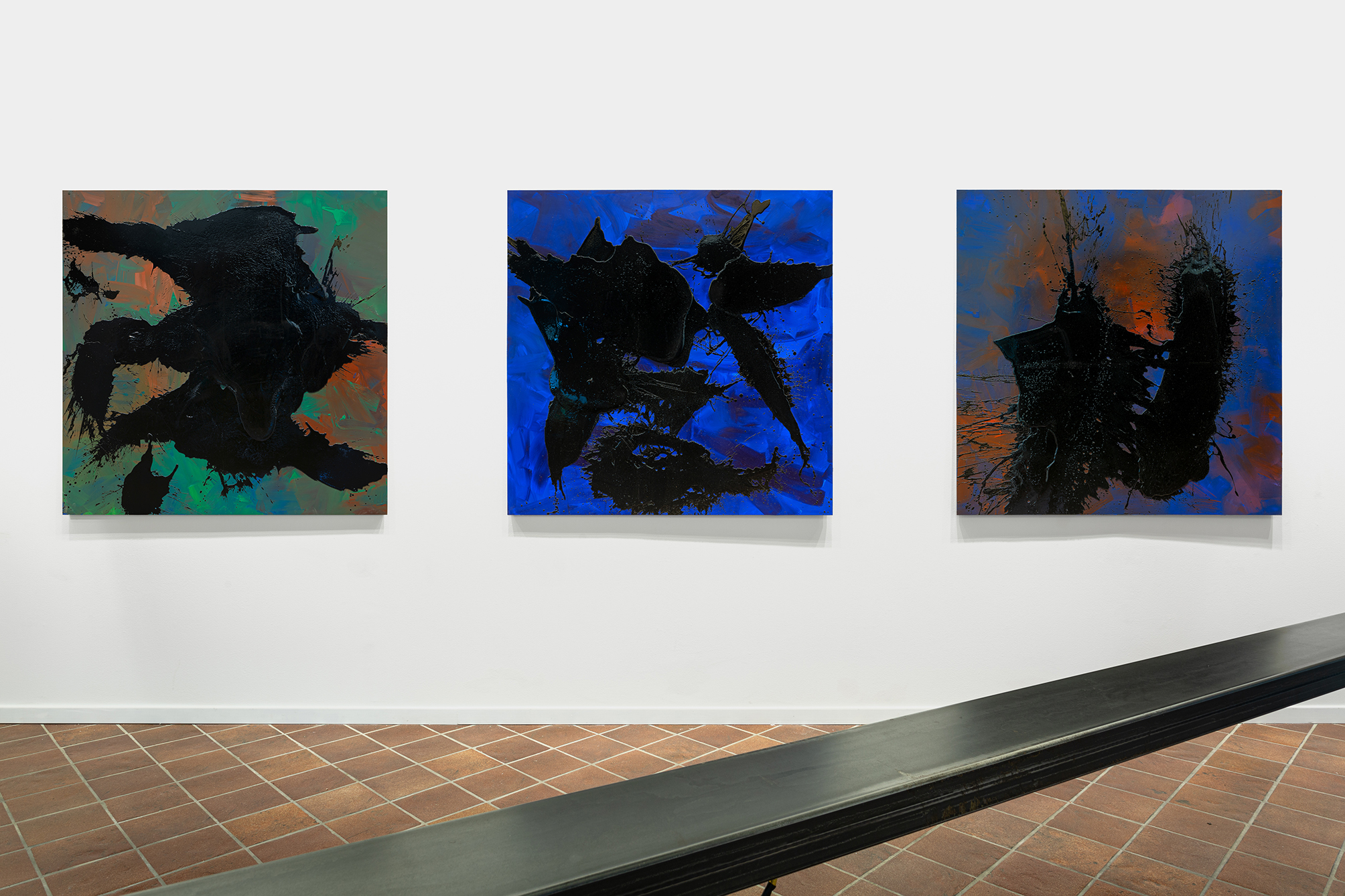 Le opere, invase dal catrame, appaiono come sedimentazioni geologiche, un monito del tempo che scorre. Sotto il catrame troviamo una pittura, una storia occultata, soffocata, è un quadro che per rivelarsi ne distrugge un altro, un’entità che prevale nella sua densità oscura. La scelta della tecnica è particolarmente evocativa: un materiale edilizio, e perciò usato per costruire, ma che nel colare sembra lava bruciante e distruttiva. Il parallelismo offerto è di un potere che nell’affermazione di se stesso inghiotte e reprime ogni cosa nel tentativo di divenire totale. Come può il singolo opporsi alla compatta visione offerta da quel potere?