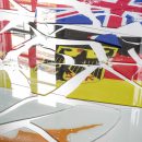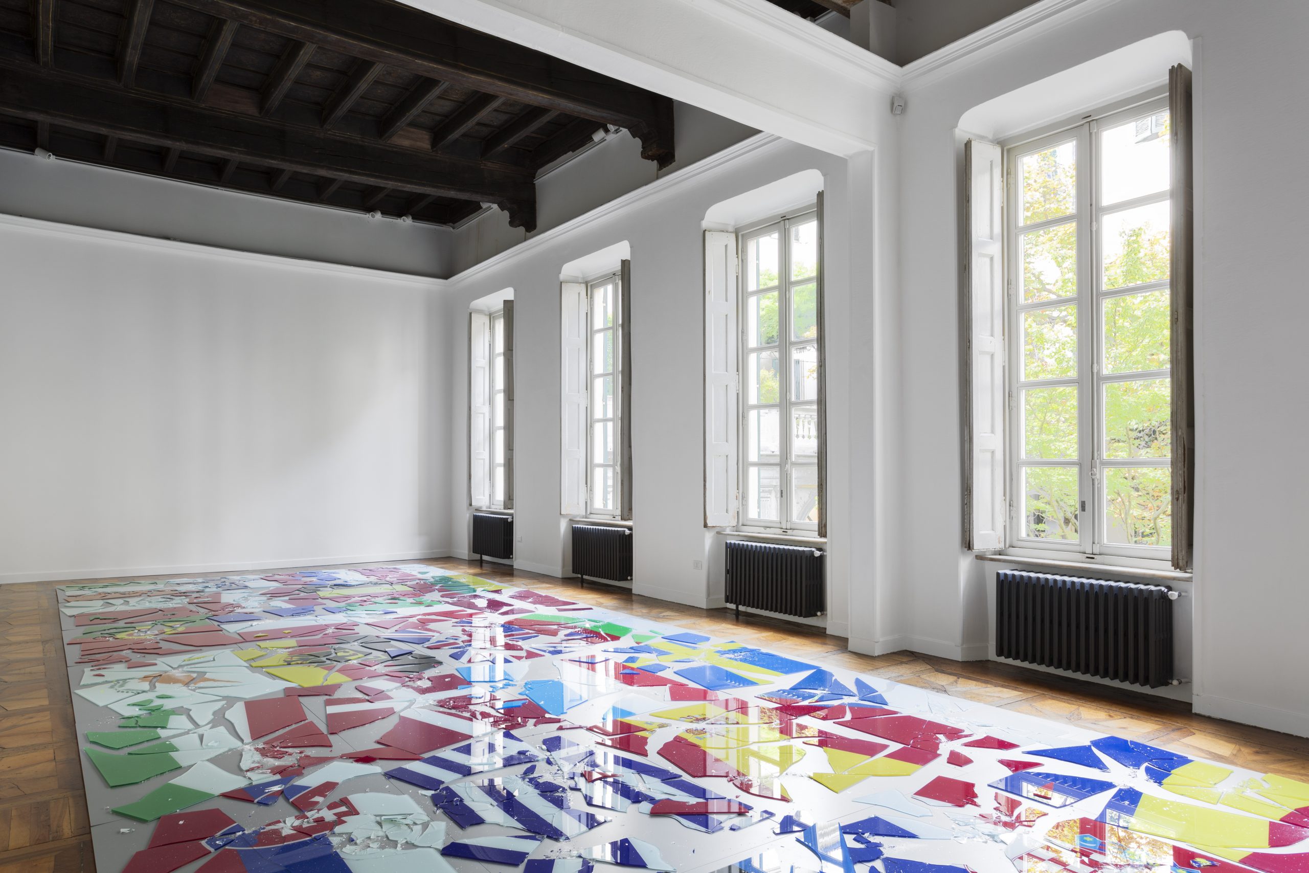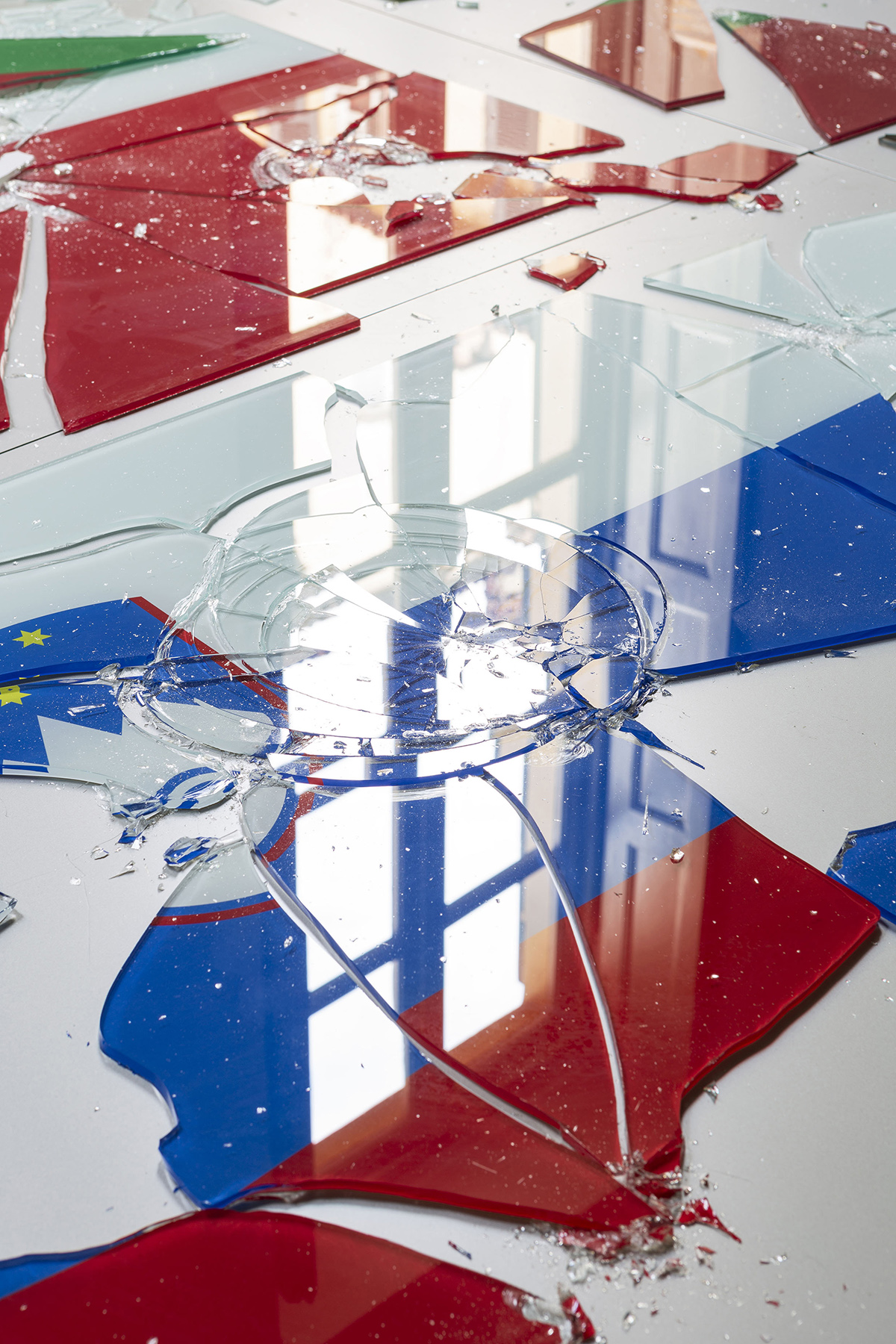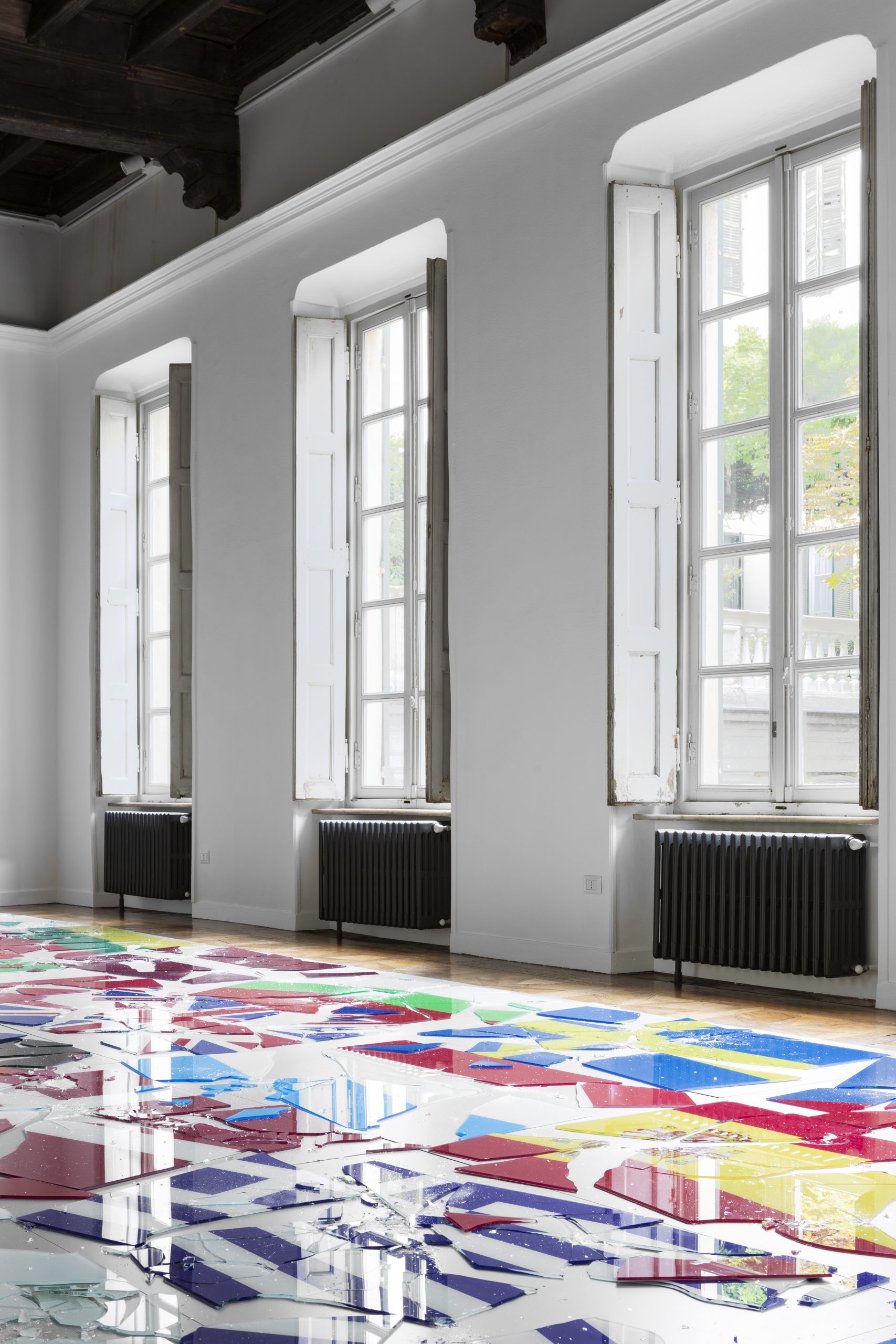 Come di consueto, Varotsos predilige il vetro, che invade il nuovo spazio della galleria, creando un’immagine inquietante ed immediatamente riconoscibile nei colori delle bandiere.