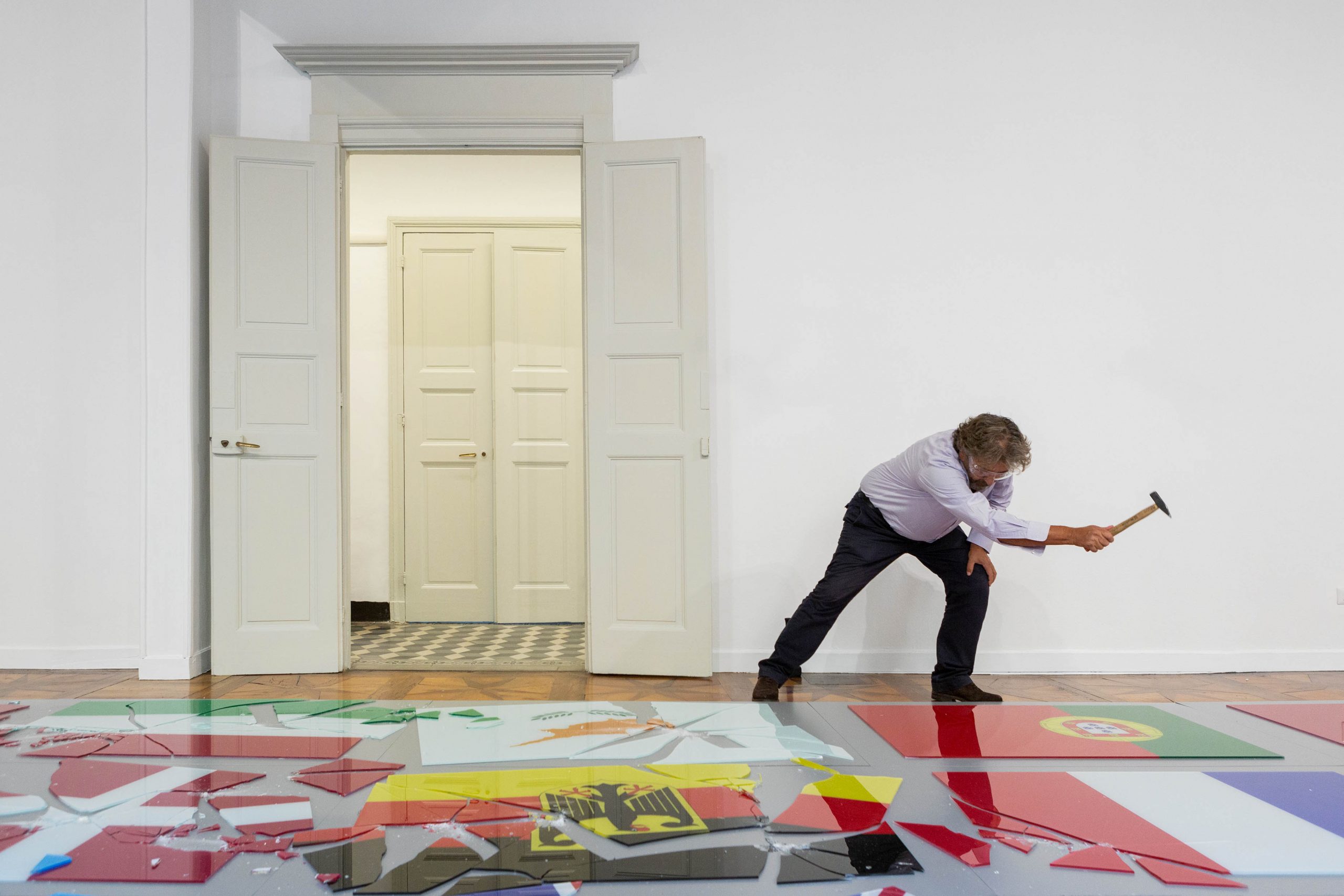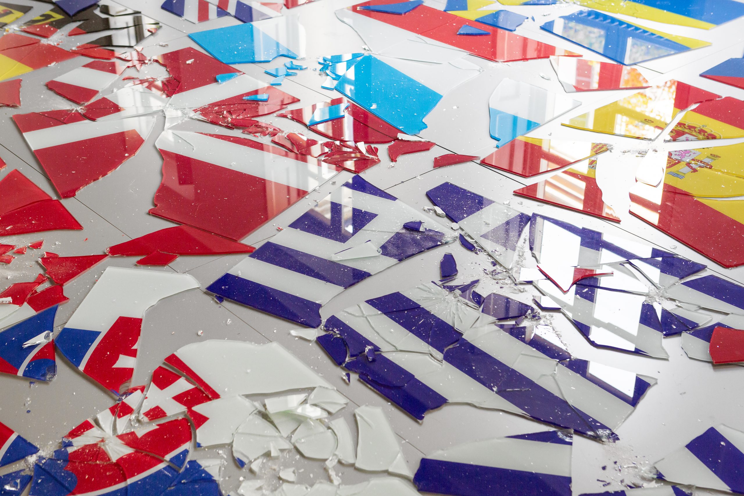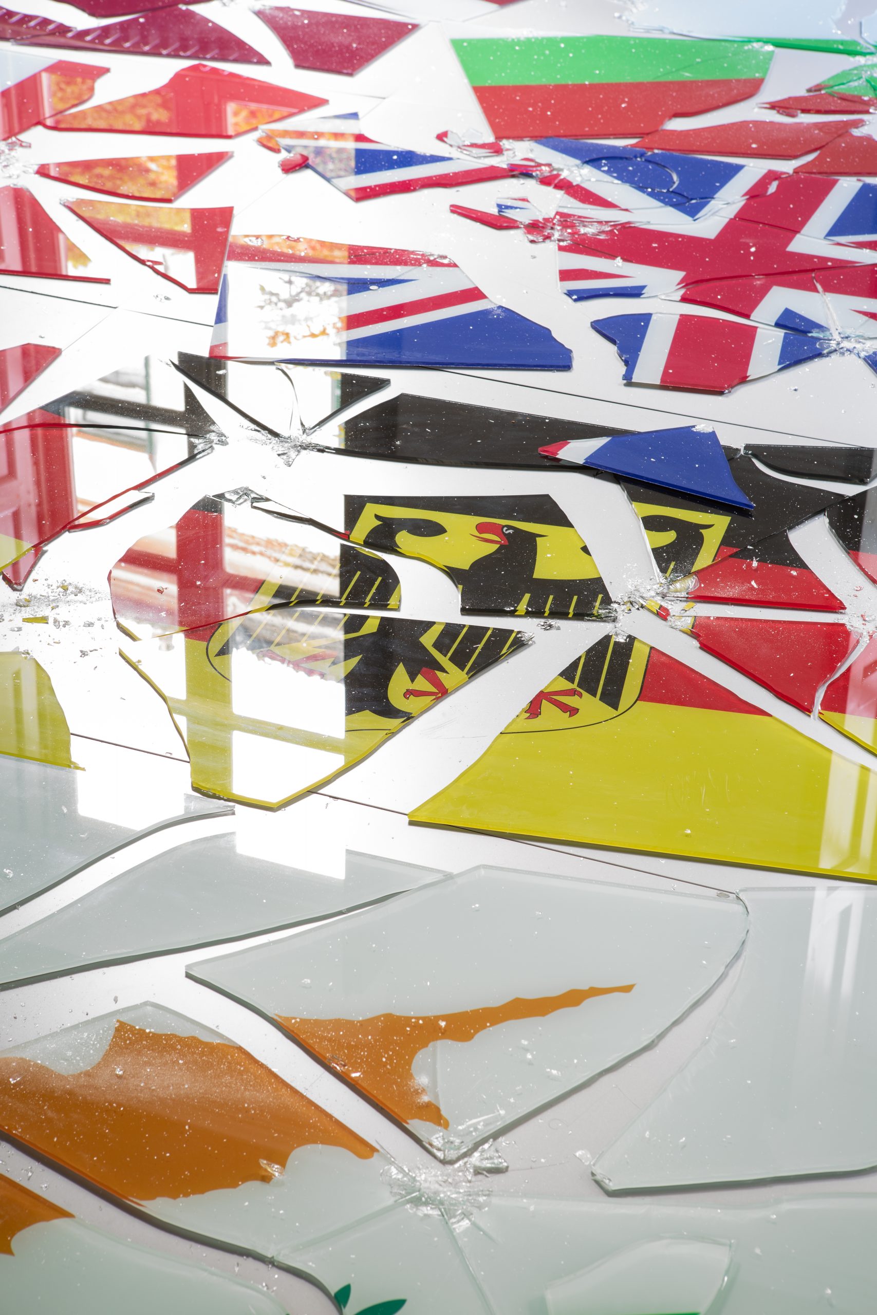 Con questa immagine dell’UE andata in pezzi, l’artista greco restituisce una lucida rappresentazione del rischio della sua dissoluzione e del suo rapporto precario con il resto del mondo. Per Varotsos “L’Unione Europea – per quanto un’idea geniale – è ora minacciata da forze centrifughe che non sappiamo davvero dove porteranno. Per anni nascondevamo le cose sotto il tappeto, ma ora la situazione sembra essere fuori controllo: è un momento critico, è come se portassimo la bandiera della Comunità Europea e ci cadesse di mano”.