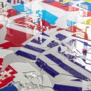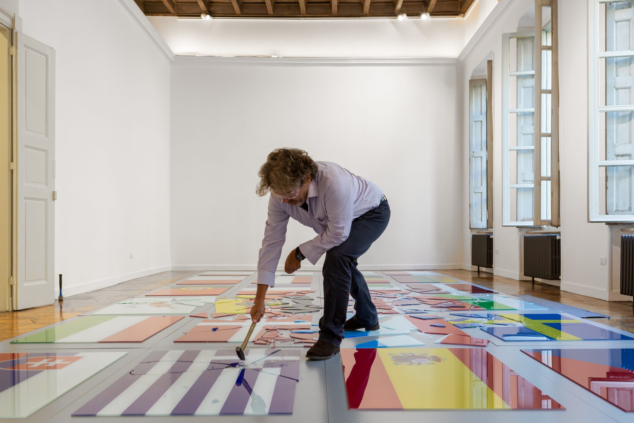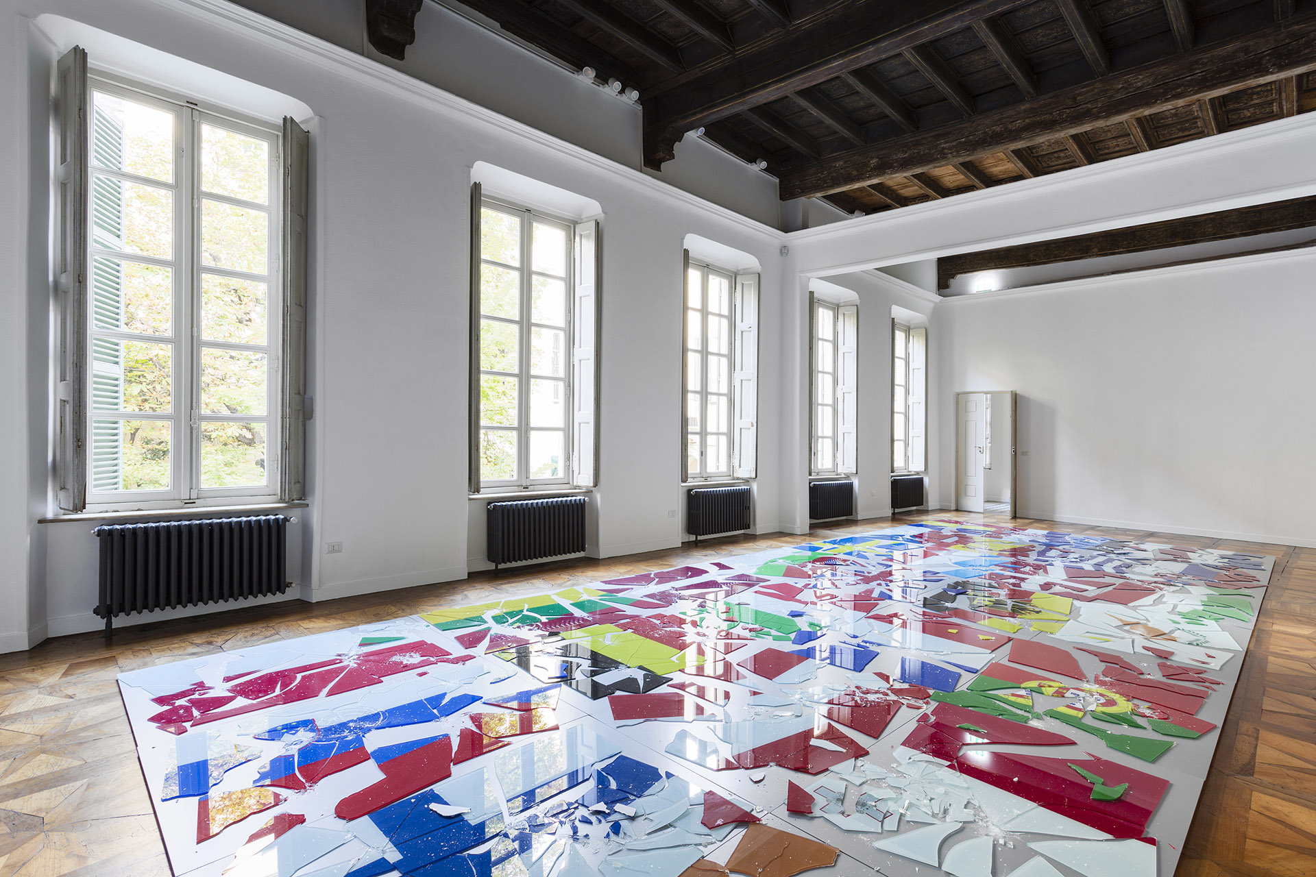 Dal 22 al 24 settembre 2020 la Galleria Giorgio Persano inaugura il nuovo spazio di Via Stampatori 4 – Torino, con la personale di Costas Varotsos “Europa 2”. Il percorso espositivo si sviluppa intorno ad un’opera centrale, dalla quale trae il titolo la mostra, che vede rappresentate le 27 bandiere degli Stati membri dell’Unione Europea, stampate a grandi dimensioni su vetro ed infrante sul pavimento.