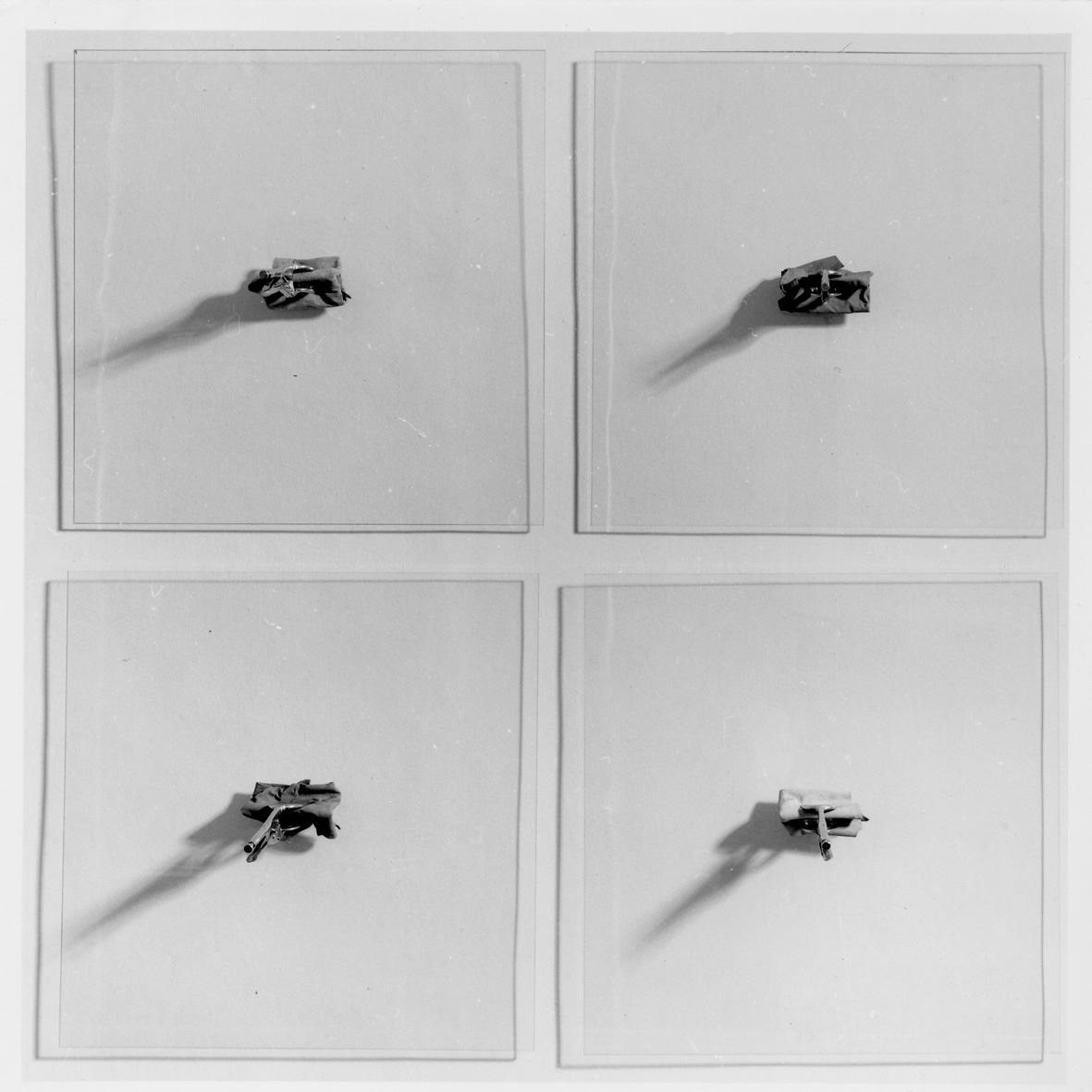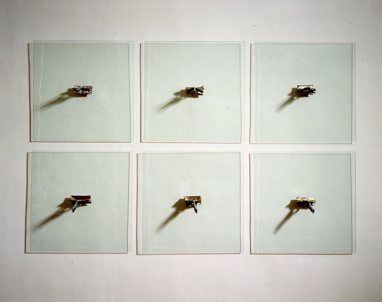 Sospese, due grate di vetro si fronteggiano. Al centro dello spazio vi è – secondo la definizione dello stesso Romano -“un archivio di materiali incastrati con il feltro tra le mensole di ferro”.