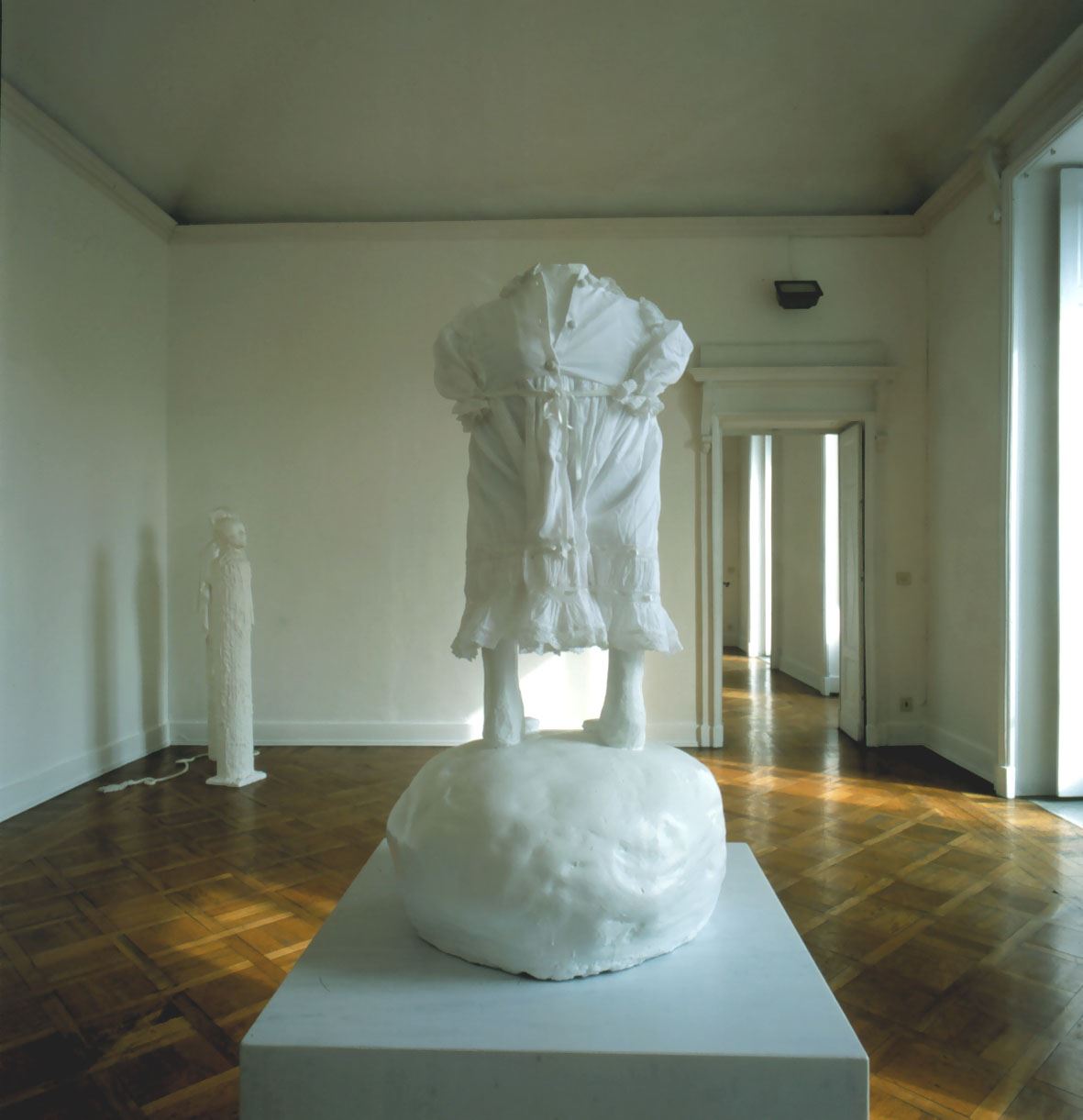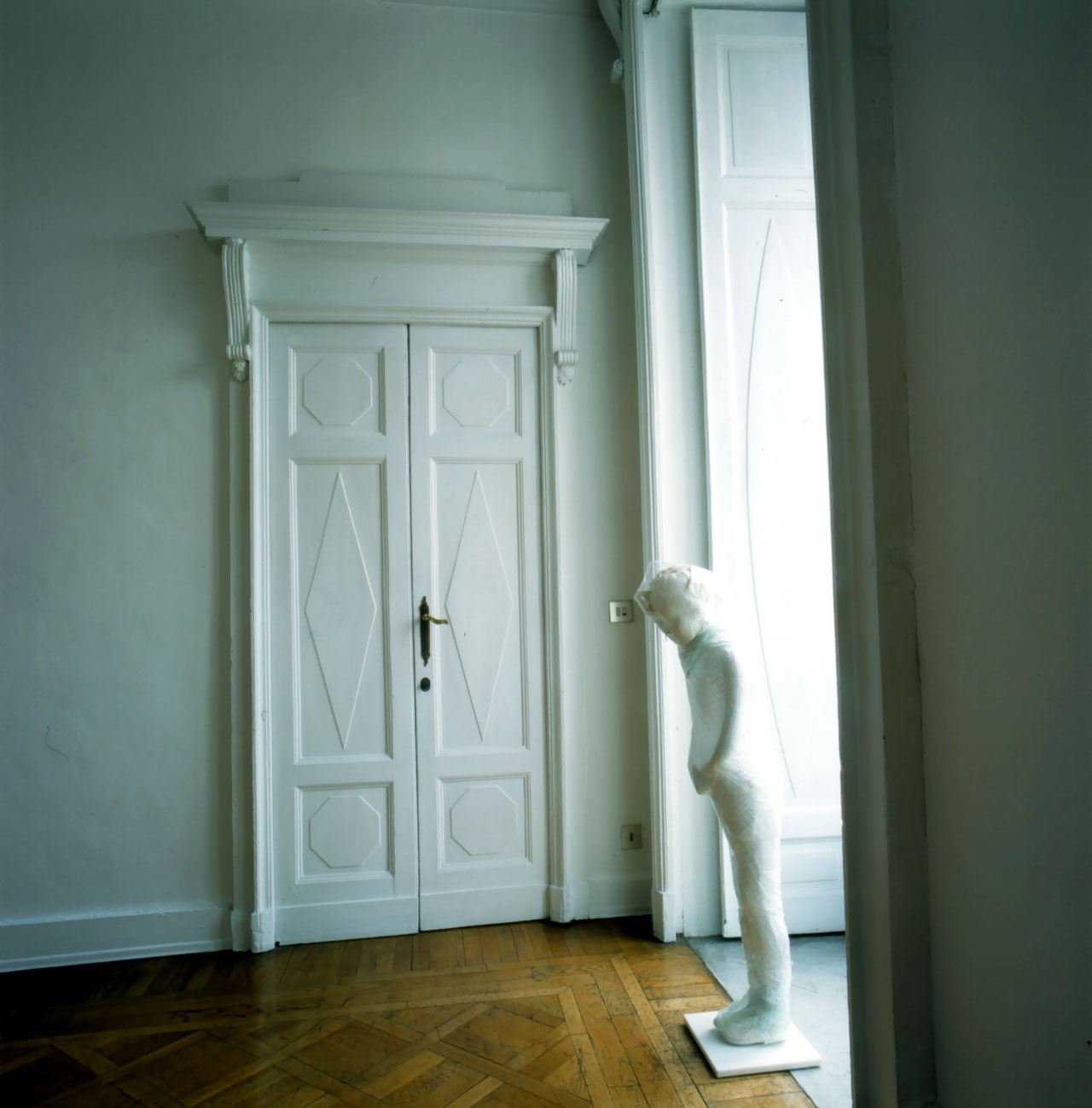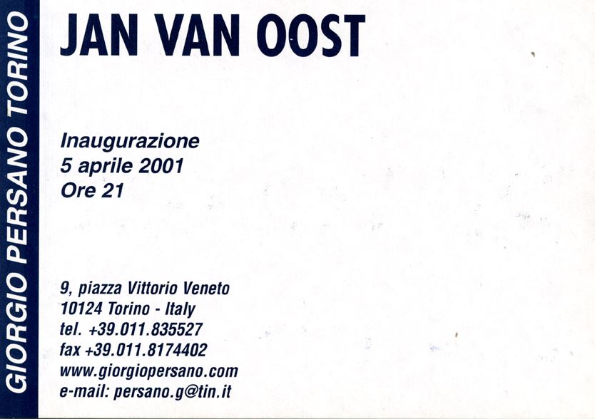 L’esposizione di Jan Van Oost alla Galleria Giorgio Persano di Torino vuole proporre un nuovo modello di comunicazione, dove prevale il desiderio dello scambio intersoggettivo. L’artista assume il ruolo di guida e di stimolo per penetrare nel mondo interiore dell’uomo e gli spettatori, ognuno con le proprie storie personali, vengono a tal punto coinvolti da diventare emotivamente parte dello scenario della mostra. La capacità dell’artista di far condividere intense commozioni, di vivere insieme situazioni culturali di intensa partecipazione emotiva fa nascere l’occasione di costruire un evento di forte impegno etico che implica una nuova maturazione morale degli individui. La comunicazione come fondamento essenziale dell’etica apre infatti la strada all’atto della “partecipazione” degli individui e dei gruppi al divenire del fatto artistico. La linea, quindi, che parte dalla comunicazione per arrivare alla partecipazione è per Van Oost la sola capace di modificare nei fatti le strutture accentrate ed autoritarie che tanta parte hanno avuto nell’assetto socio-politico ed organizzativo della seconda parte del XX secolo.