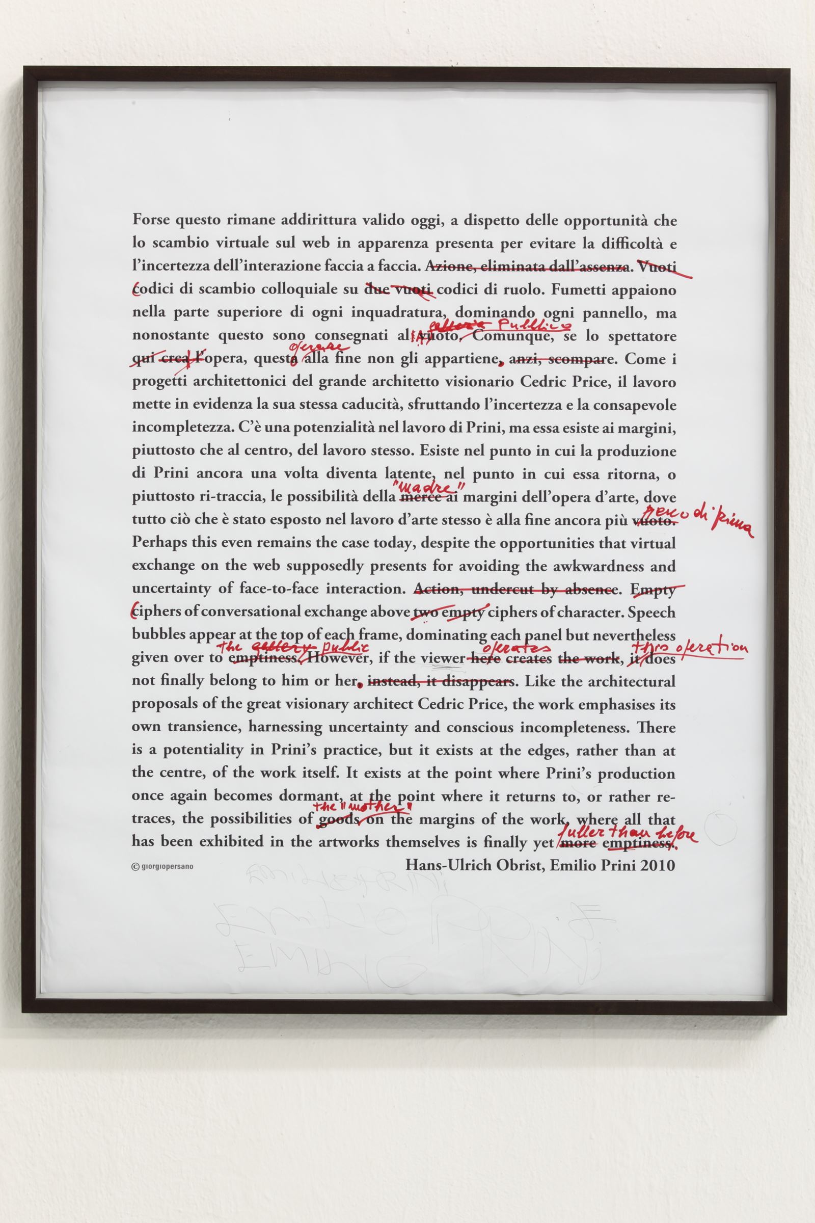 Il critico Hans Ulirch Obrist, dopo aver visto l’installazione, scrive un articolo su Mousse “Lost and Found Emilio Prini”. In seguito, da un’intervista a Prini, nasce un testo intitolato Un viaggio senza compromessi. Prini visiona il testo e compie un’ulteriore operazione di sottrazione, questa volta intervenendo sullo scritto e approvandone solo alcune righe. Il testo selezionato verrà usato per un manifesto sul quale, una volta realizzato, Prini applica un’operazione di sostituzione di alcune parole utilizzate da Obrist. Con questi nuovi cambiamenti, che l’artista certifica ed autentica, è nata l’ultima versione del manifesto.