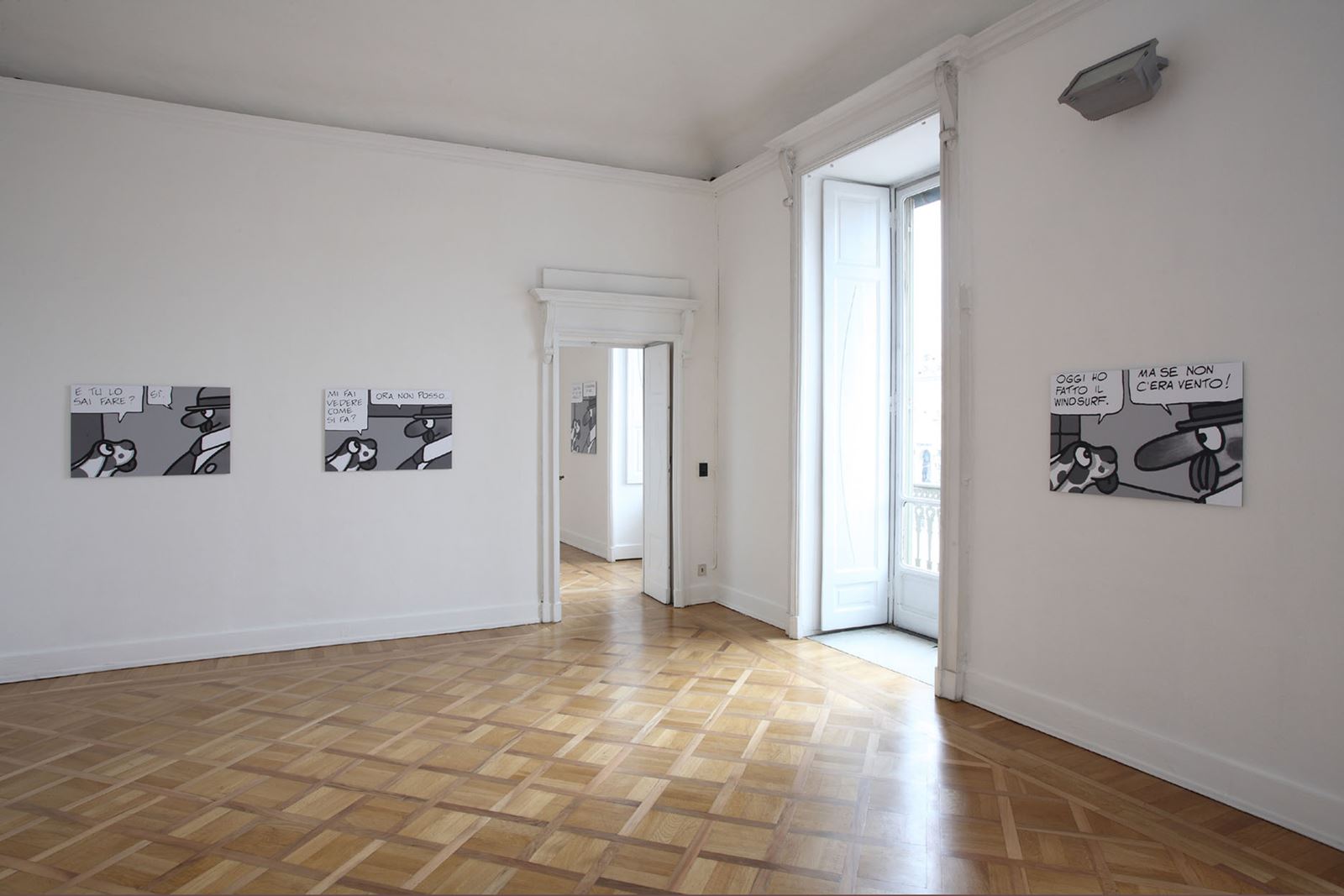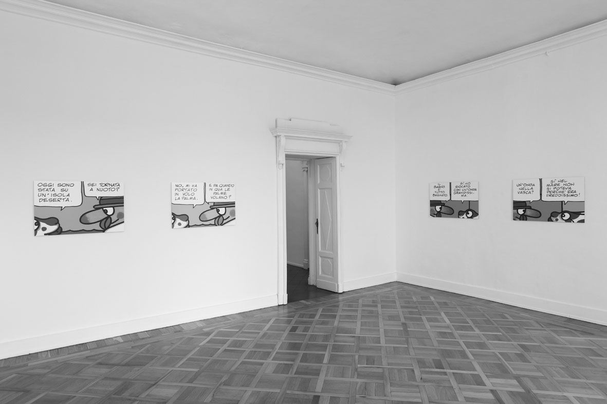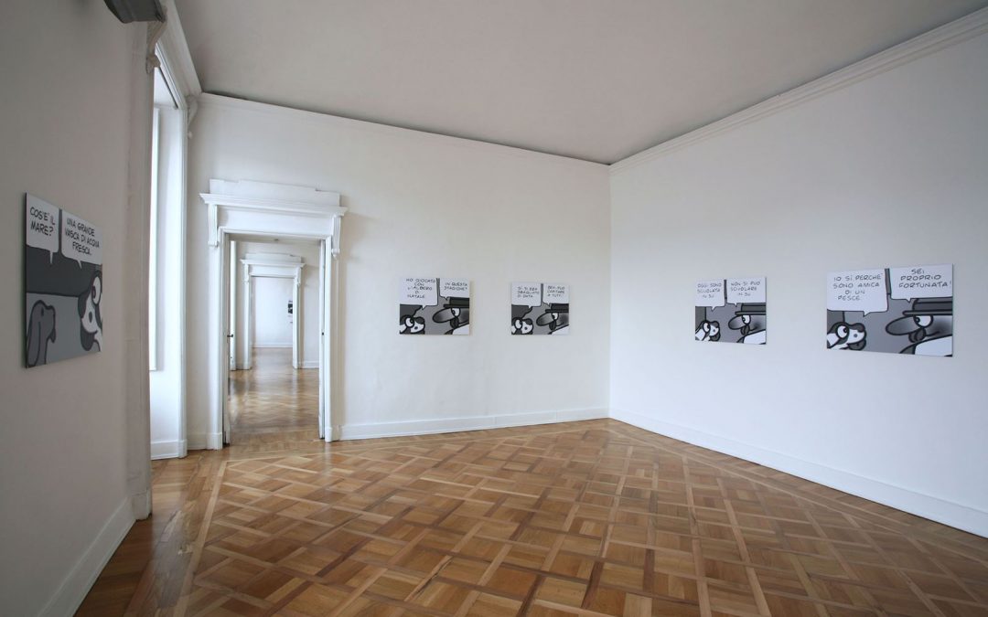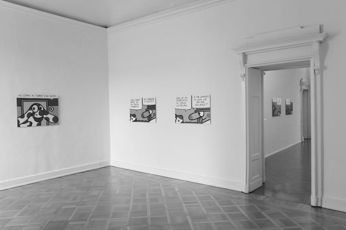 Prini compie comunque un’azione creativa, che consiste nella sottrazione. Le immagini, scansionate dal fumetto, sono state ingrandite per poi essere stampate su alluminio, è stato eliminato il colore e la sua assenza aggiunta ad una fattura quasi industriale ha fatto si che le immagini appaiano piatte e senza quella vivacità che è tipica del fumetto della Pimpa. Gli ingrandimenti hanno reso le stampe quasi tutte della stessa dimensione ed una volta installate in galleria l’hanno riempita prendendo il posto di ipotetici quadri. Queste immagini sono state tolte dai vari contesti narrativi a cui appartenevano e l’unico riguardo che l’artista ha avuto è stato quello di preferire quelle in cui apparivano la Pimpa e l’Armando. Così, pur essendo tutte diverse ed appartenendo a diverse storie, il risultato è che, se da un lato riamane evidente e anzi enfatizzato il rapporto paritario tra l’uomo e il cane, dall’altro lo spettatore deve fare uno sforzo creativo per superare il vuoto narrativo imposto da Prini.