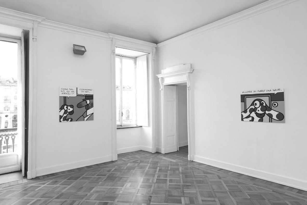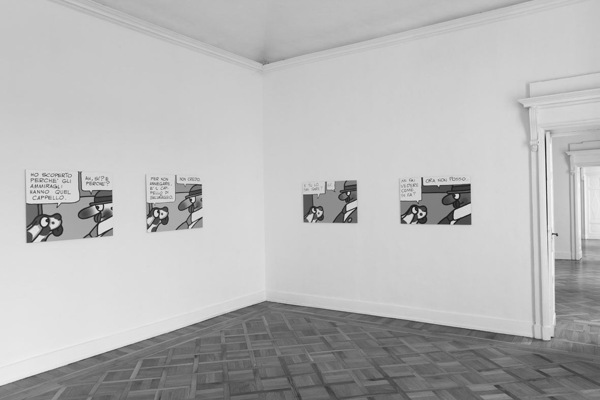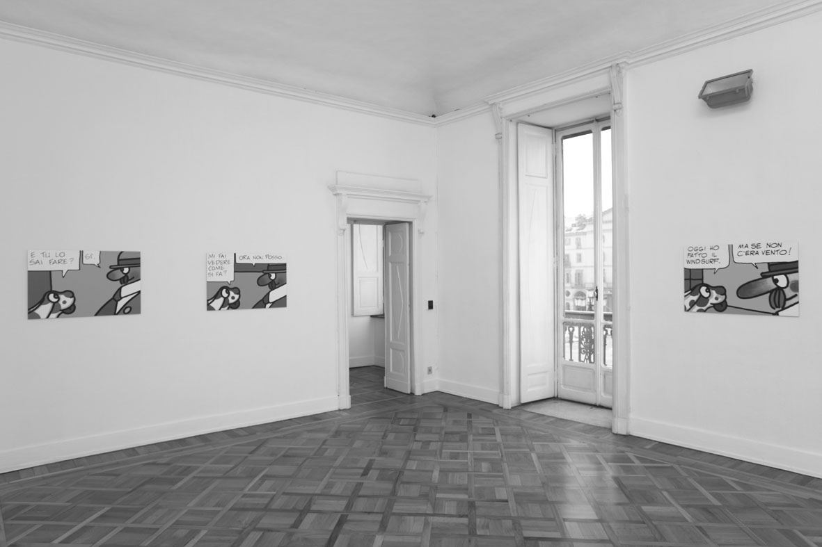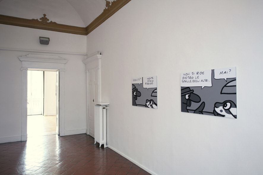 Prini compie comunque un’azione creativa, che consiste nella sottrazione. Le immagini, scansionate dal fumetto, sono state ingrandite per poi essere stampate su alluminio, è stato eliminato il colore e la sua assenza aggiunta ad una fattura quasi industriale ha fatto si che le immagini appaiano piatte e senza quella vivacità che è tipica del fumetto della Pimpa. Gli ingrandimenti hanno reso le stampe quasi tutte della stessa dimensione ed una volta installate in galleria l’hanno riempita prendendo il posto di ipotetici quadri. Queste immagini sono state tolte dai vari contesti narrativi a cui appartenevano e l’unico riguardo che l’artista ha avuto è stato quello di preferire quelle in cui apparivano la Pimpa e l’Armando. Così, pur essendo tutte diverse ed appartenendo a diverse storie, il risultato è che, se da un lato riamane evidente e anzi enfatizzato il rapporto paritario tra l’uomo e il cane, dall’altro lo spettatore deve fare uno sforzo creativo per superare il vuoto narrativo imposto da Prini.
