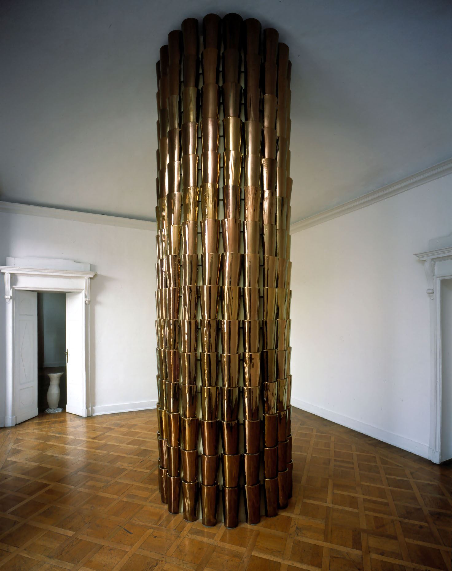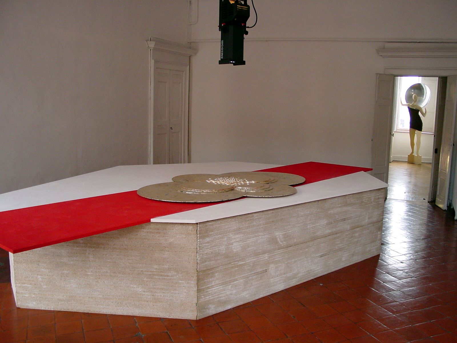 Sono l’artista italiano Marco Bagnoli e sono stato invitato ad allestire una mostra in Spagna. Ho come elementi della mostra: una statua di Apolllo su un piedistallo con l’indice della mano destra alzato; un pilastro ricoperto di tegole d’oro; un canneto di metallo. Apollo è il Dio solare cantato nell’Inno omerico, il pilastro di tegole d’oro lo stabilizzarsi dell’isola vagante di Delos baciata dai raggi del sole; il canneto, disposto a quinconce, è il verde della foresta cresciuta sulla cima.