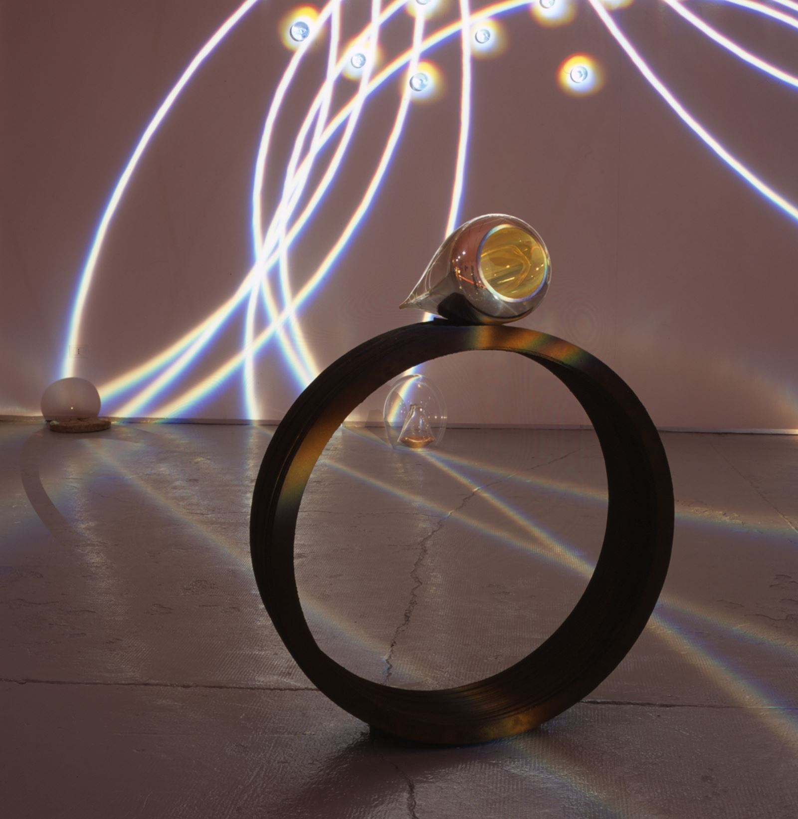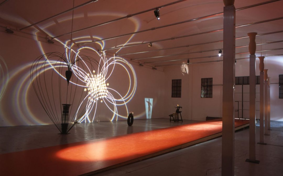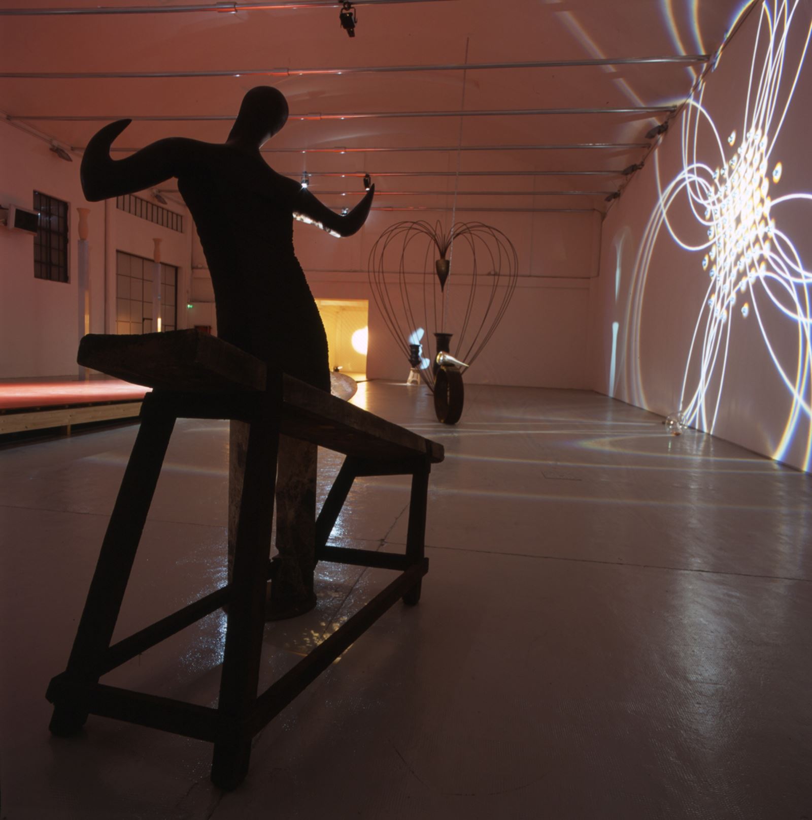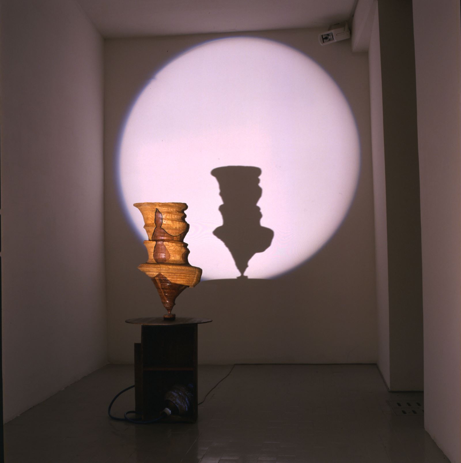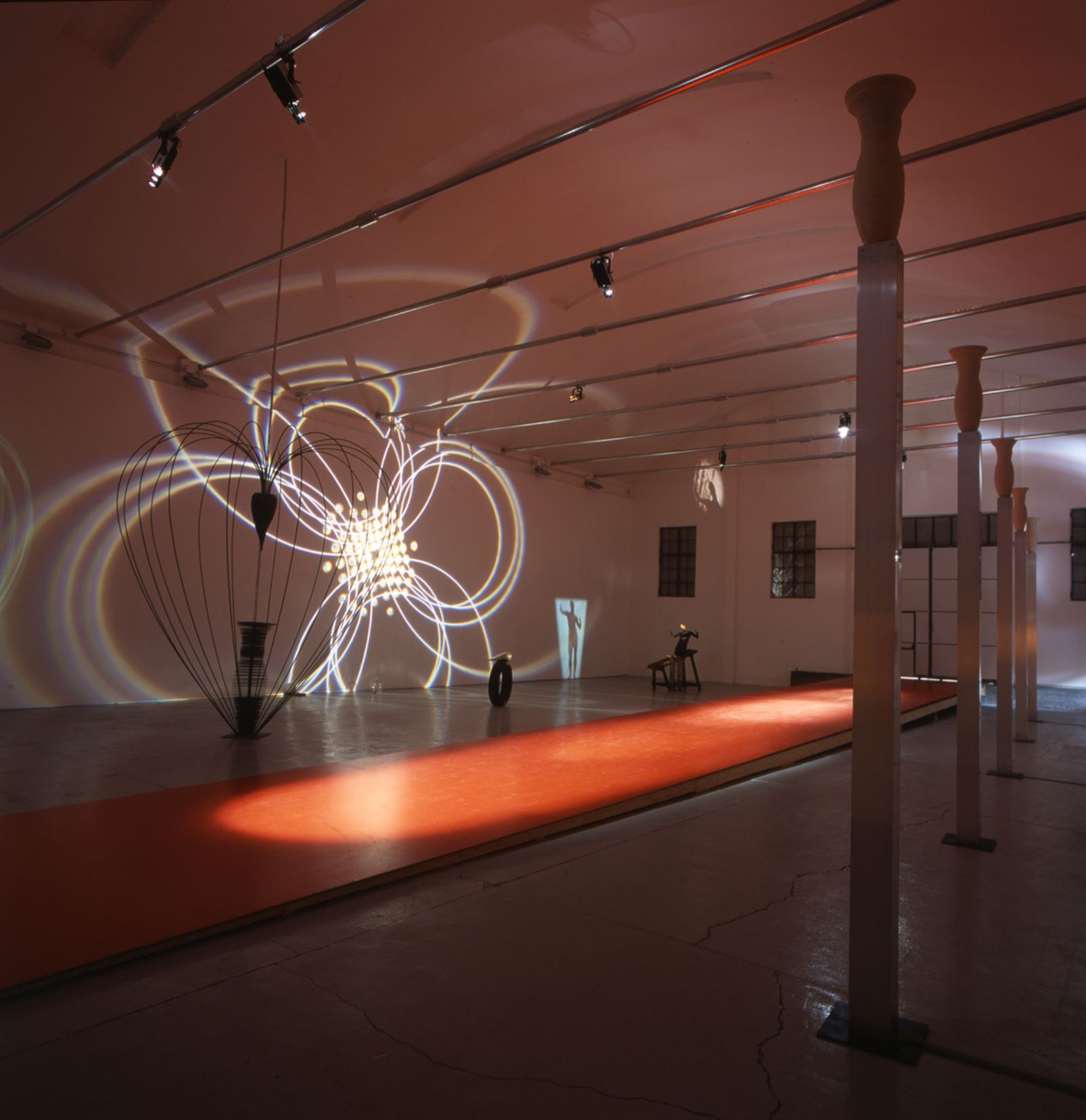 Senza Piedi una struttura a “mongolfiera” i cui raggi partono da terra raggruppandosi in alto in una punta conica rivolta verso il suolo. Questa punta, come l’ultimo dei cinque elementi che compongono lo stupa, indica il vuoto. Lo stupa, che e’ un mandala tridimensionale, e’ il tempio buddista, in collegamento metaforico con le componenti elementari del cosmo. Un’ombra della mongolfiera in un perenne movimento circolare e’ poi proiettata sulla parete a sottolineare il carattere senza peso della struttura e il suo eterno moto.