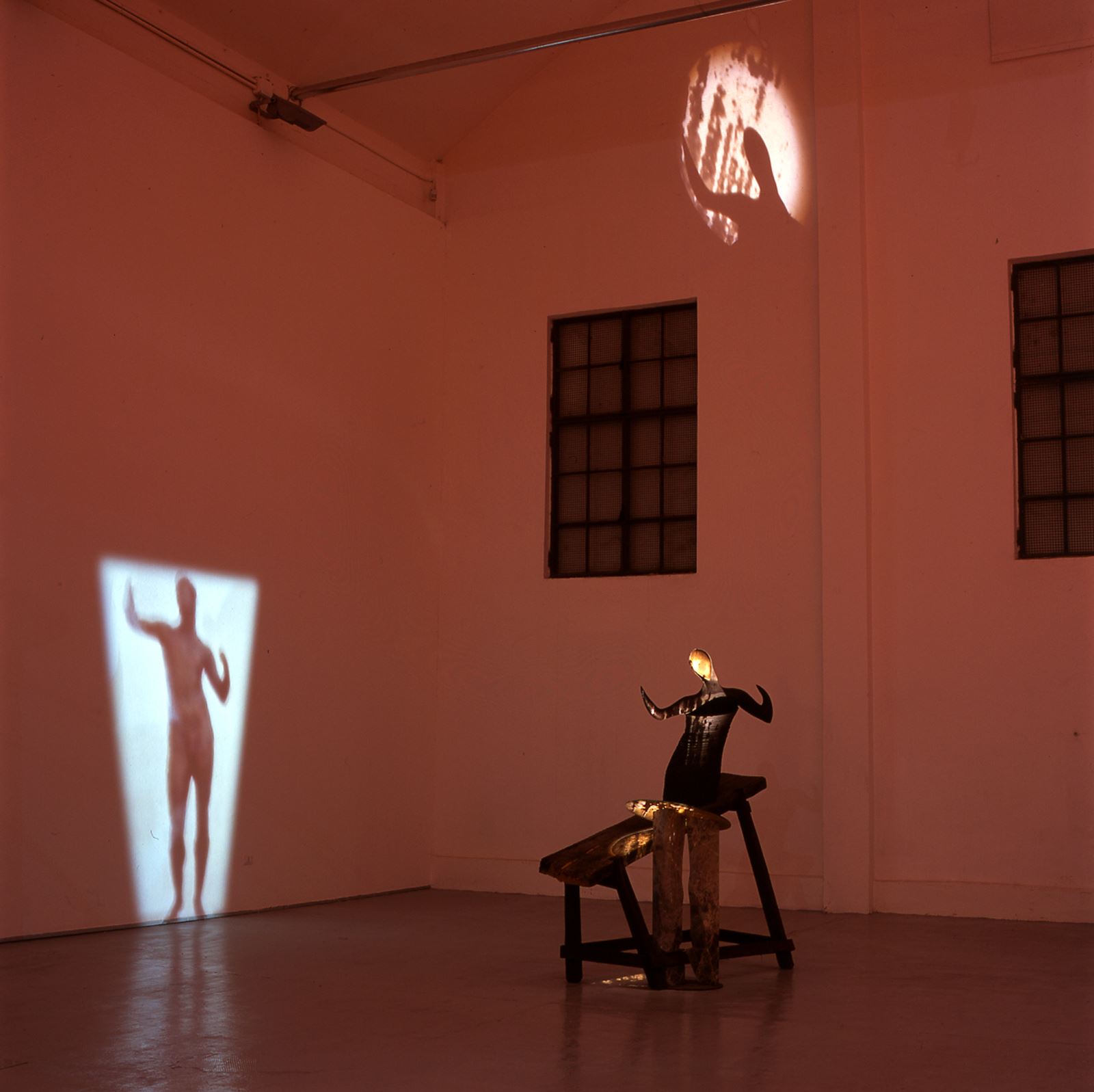 In piedi, una scultura in ceramica dall’apparenza amorfa, ma che prende corpo nella proiezione della sua ombra. Sul muro infatti luce ed ombra disegnano i volti di un vecchio e di un giovane.