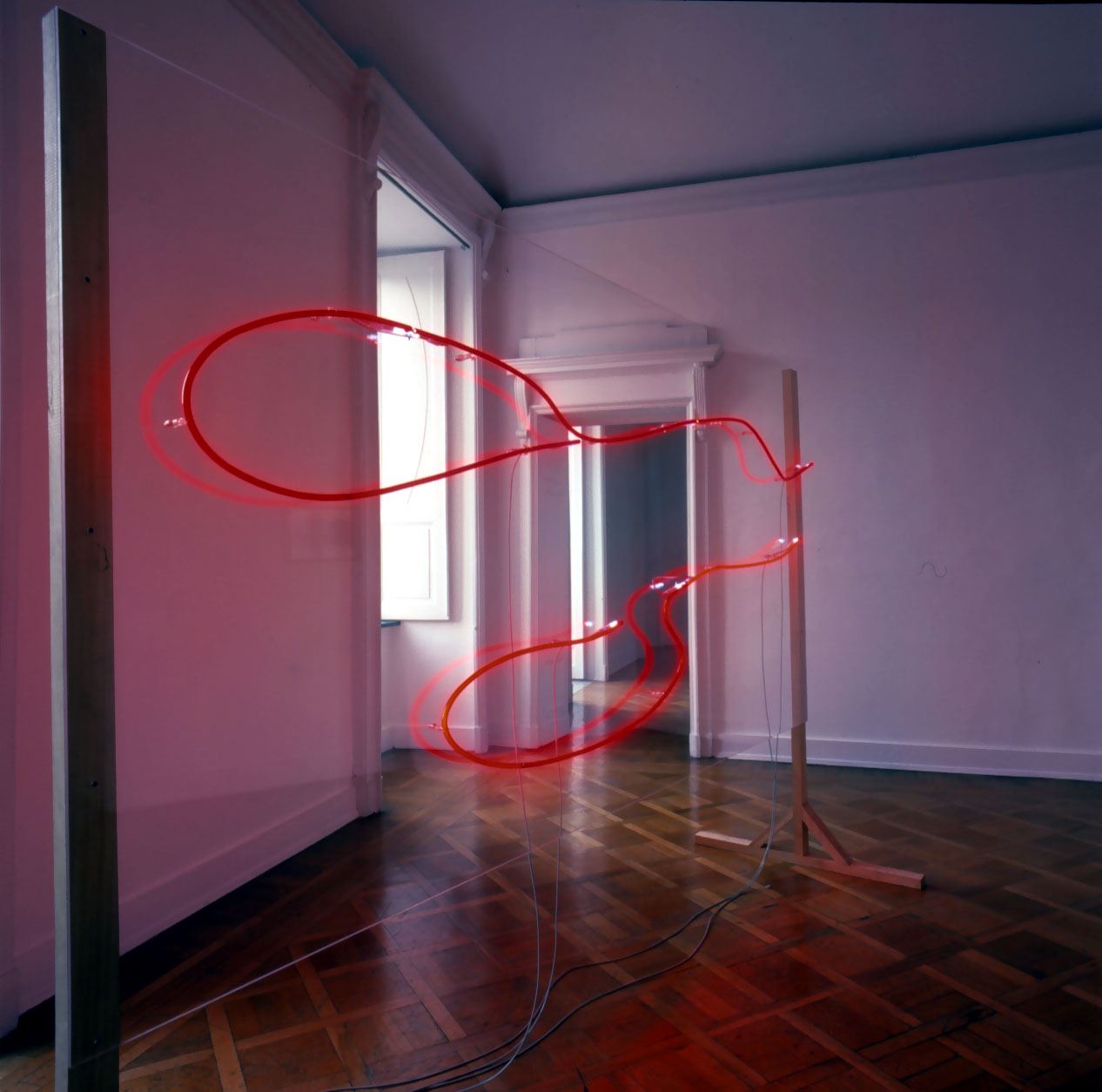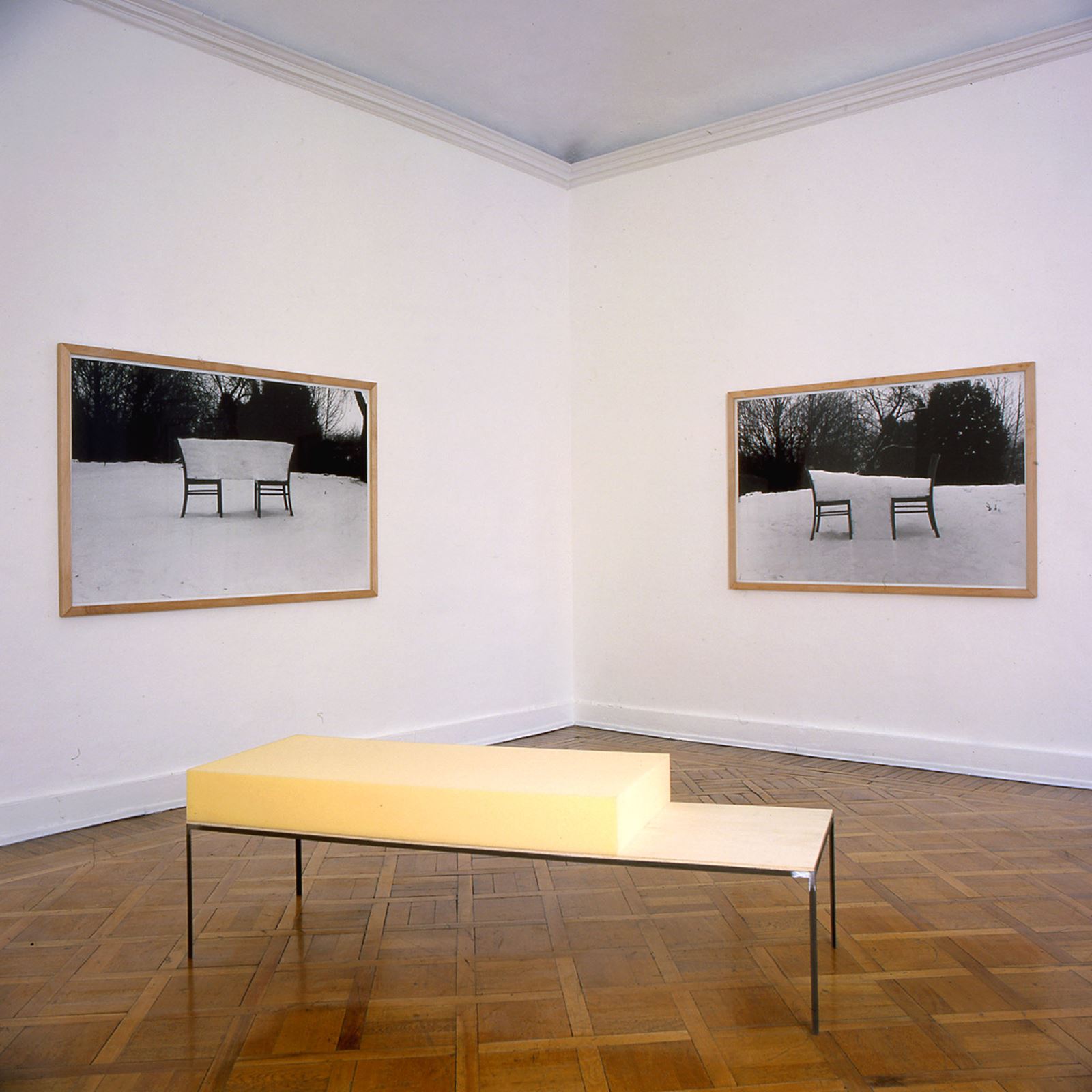 Nello spazio centrale meglio si esprime il senso della processualità, del lavoro in corso: un grande pannello di plexiglass, animato da percorsi luminosi al neon, funge da lente ma anche da mobile, lavagna e schermo attraverso cui l’artista osserva ed arreda lo spazio. La continuità delle pareti è interrotta da un plico di grandi fogli di carta sui quali un segno calligrafico viene riprodotto e ingigantito. Infine i mobili, dal disegno fine ed essenziale, che combinano improbabili materiali, quali l’acciaio e la gomma piuma, le sedie e la neve. Sembrano arrivare da un’altrove, probabilmente dalla realtà dei sogni. Come ha scritto Kathrin Becker a proposito di simili lavori della Serebriakova : “oggetti quotidiani vengono mostrati nella loro stranezza e messi alla portata della nostra coscienza, senza per questo diventare comprensibili”.