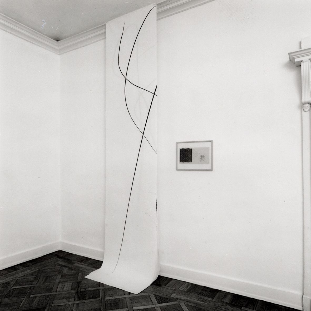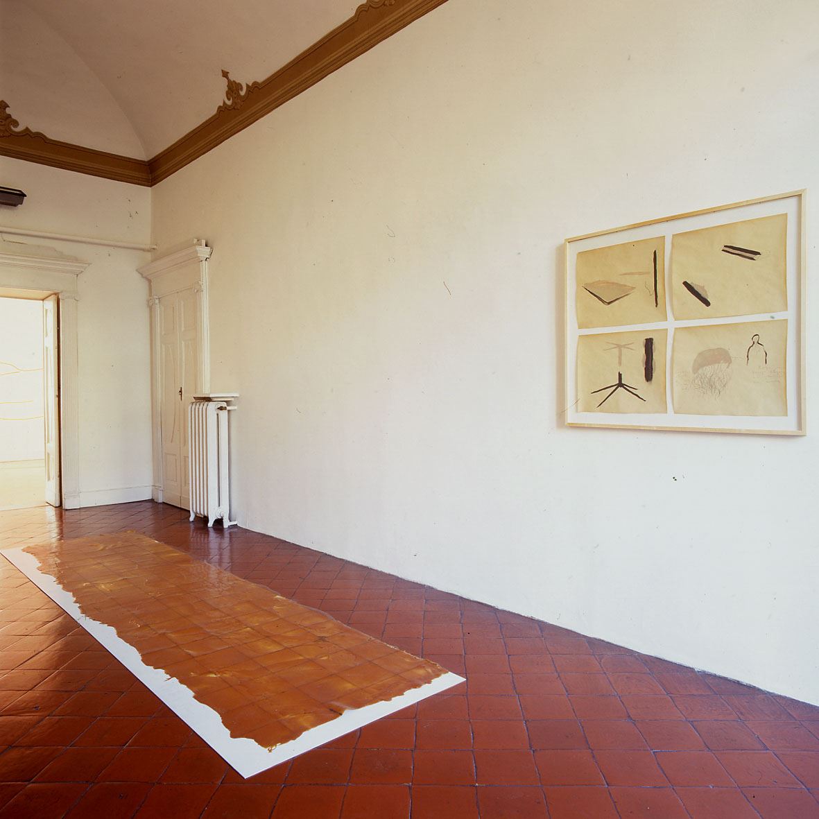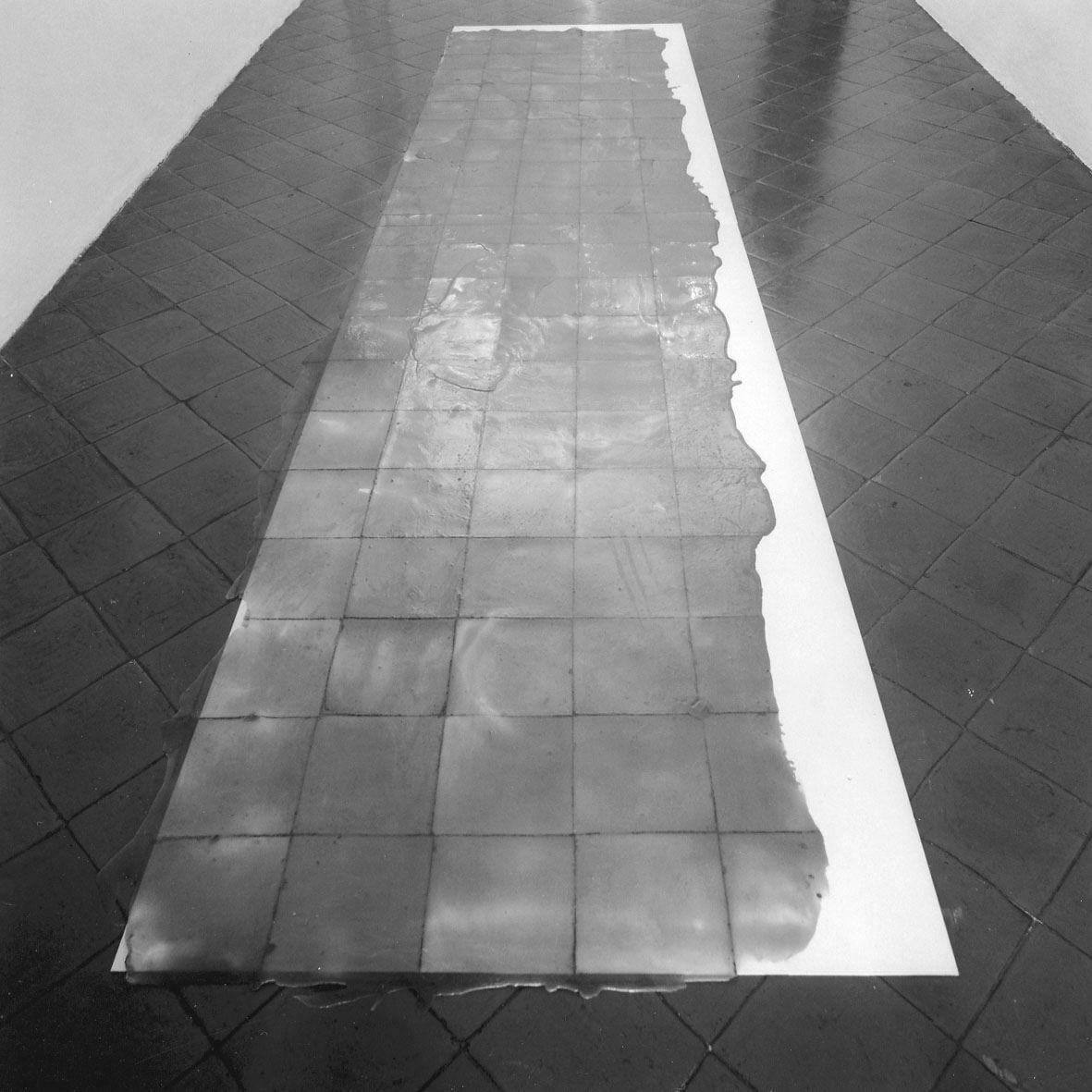 Il percorso dell’artista russa nasce a partire da un’esplorazione fisica, da un vivere lo spazio che origina e si manifesta in una realtà fatta di cose, di forme ambientate, di oggetti o avvenimenti. Si parte da un pavimento, sul quale una colata di lattice appare come una pelle che lascia intravedere la struttura sottostante. L’utilizzo di materiali edili, non artistici, mette in luce il rapporto dinamico con la struttura abitativa della galleria.