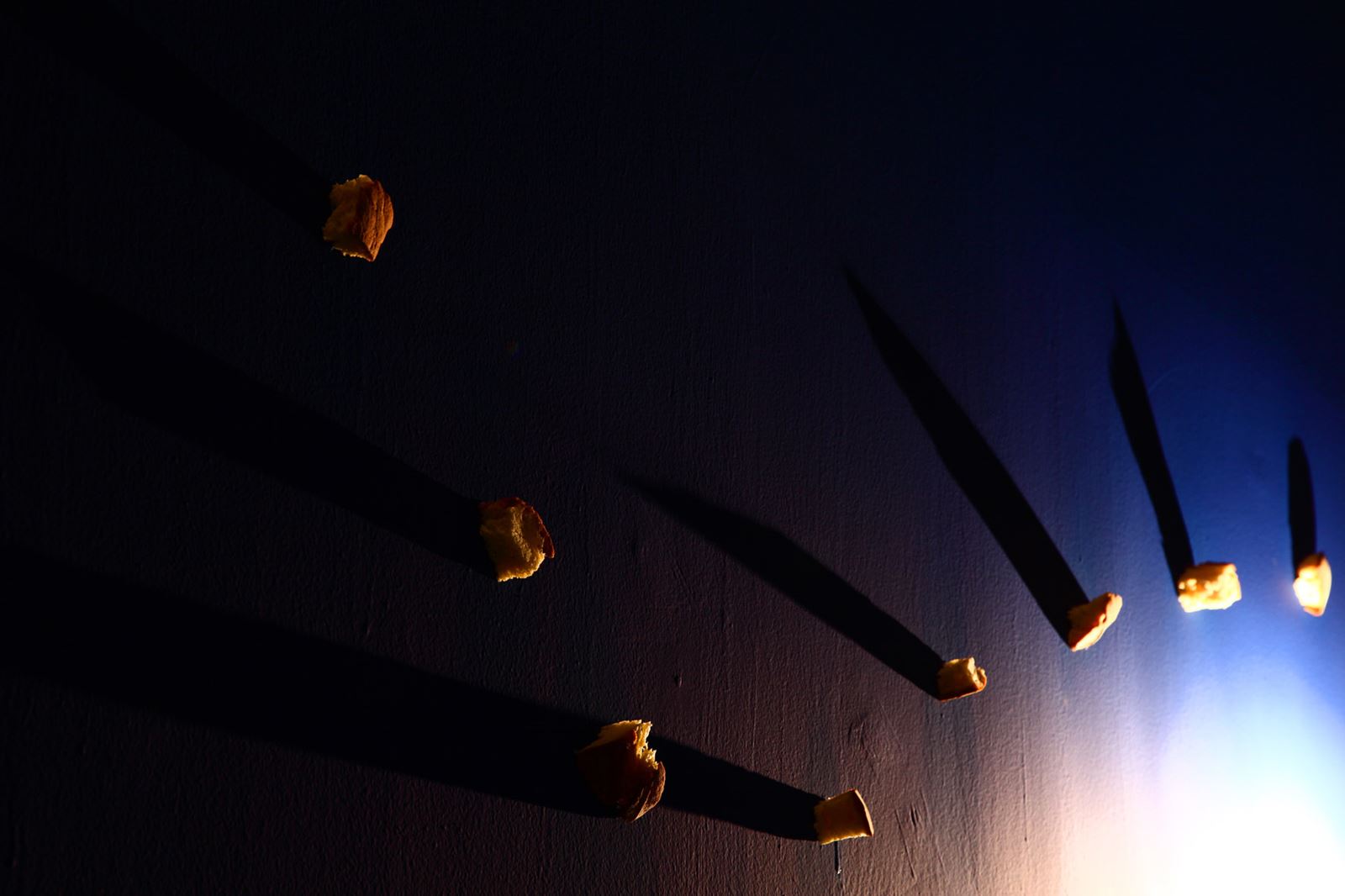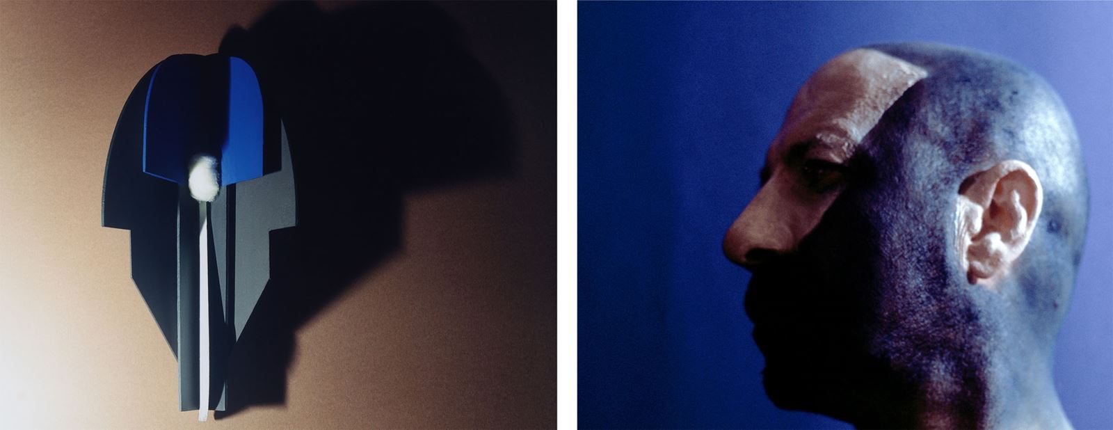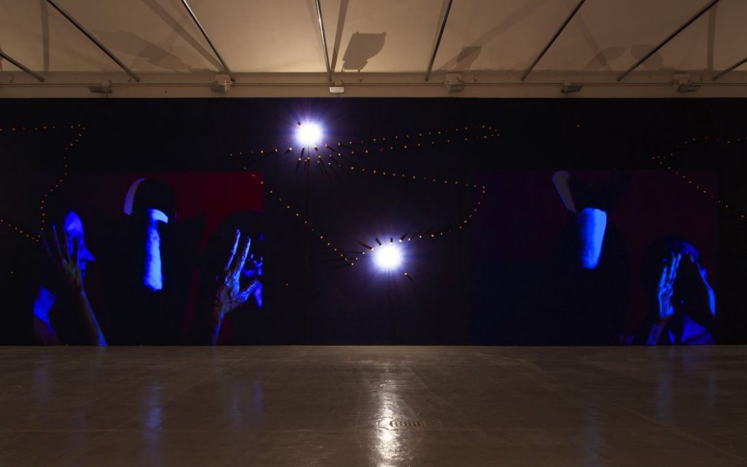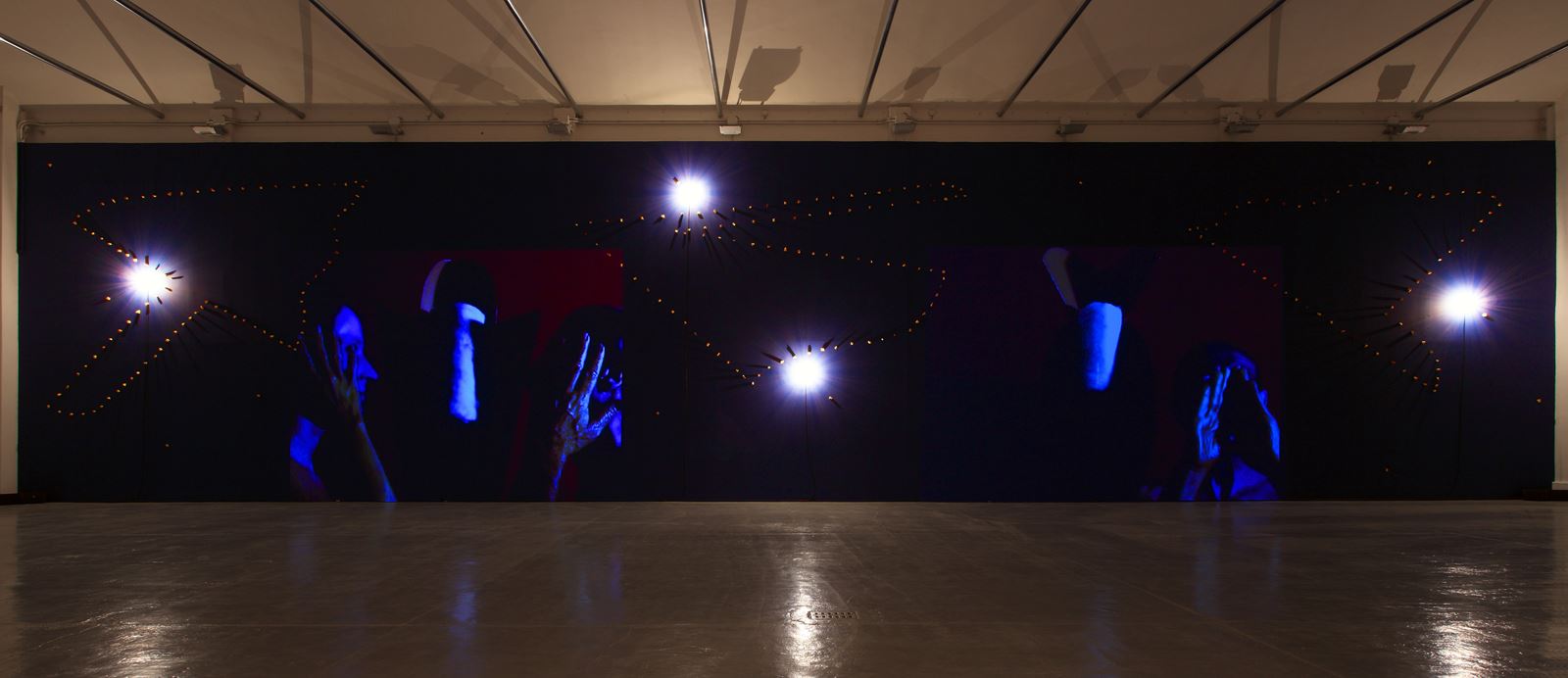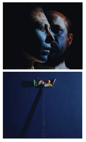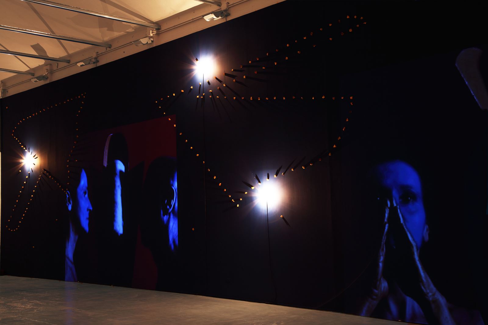Il titolo della video-installazione che attraversa l’intero spazio della Galleria costituisce il titolo stesso della mostra: IL RISVEGLIO DEL PAESAGGIO. Il pensiero astratto trova finalmente l’appoggio della carne… Non si raccontano più “storie”, ma si crea il proprio universo (A. Camus). La citazione rivela fin da subito l’impegno concettuale ed esistenziale dell’opera di Zaza. L’esigenza è quella di esprimere una sintesi, un’unità tra arte e vita, tra astrazione ed esperienza, tra materia e spirito, per creare appunto un possibile universo. Il legame tra maschile e femminile – da sempre presente nel lavoro dell’artista – viene qui messo in gioco in una dimensione totale. Due volti, una forma scultorea, il movimento delle mani, il ritmo dato dal battito del cuore e un orizzonte blu oltremare, in cui presenze simboliche disegnano un paesaggio cosmico, infinito, rinnovato dall’energia vitale.