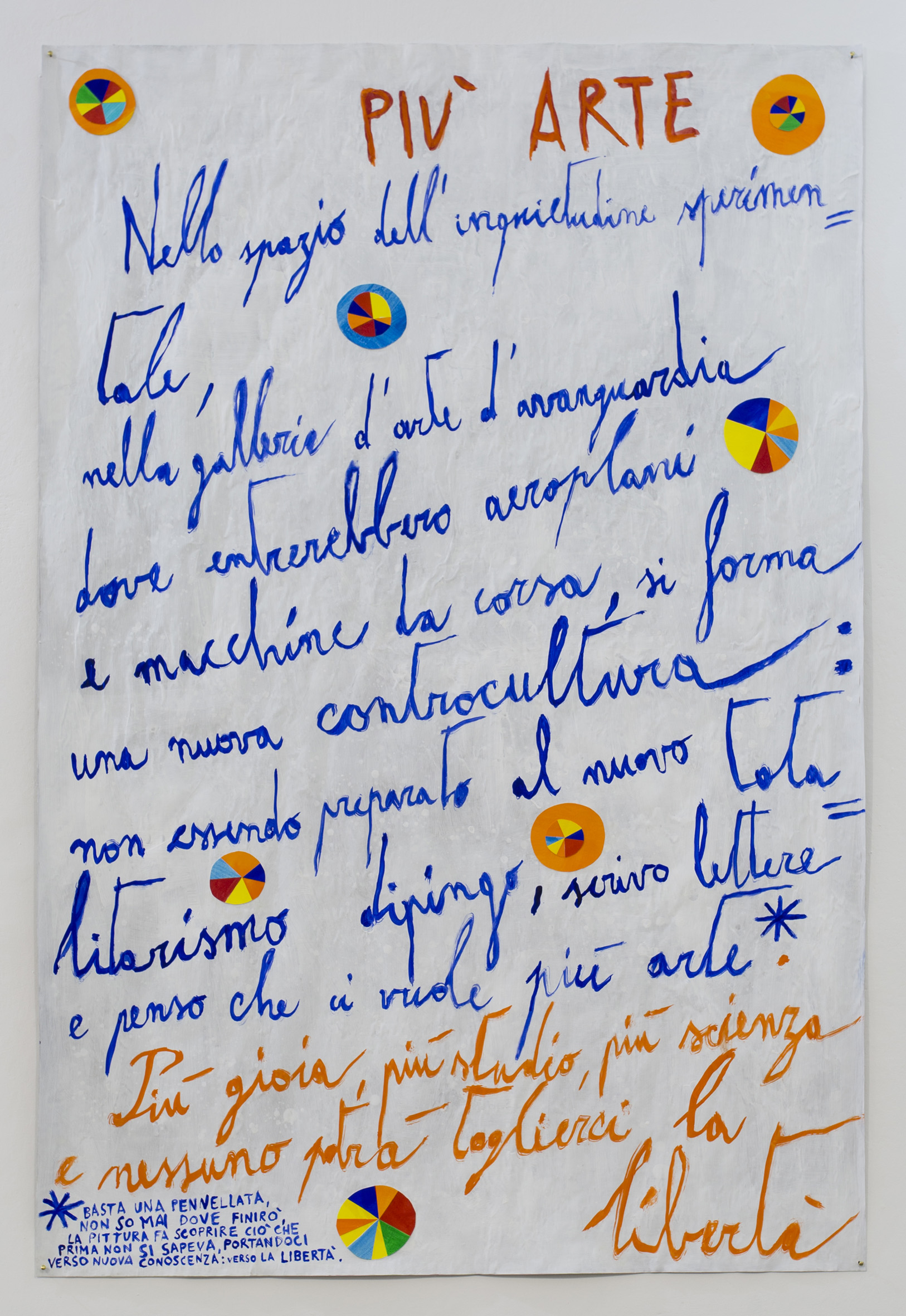 Nello spazio dell’inquietudine sperimentale, nella galleria d’arte d’avanguardia dove entrerebbero aeroplani e macchine da corsa, si forma una nuova controcultura: non essendo preparato al nuovo totalitarismo dipingo, scrivo lettere e penso che ci vuole più arte: basta una pennellata, non so mai dove finirò, la pittura fa scoprire ciò che prima non si sapeva, portandoci verso nuova conoscenza, verso la libertà.
