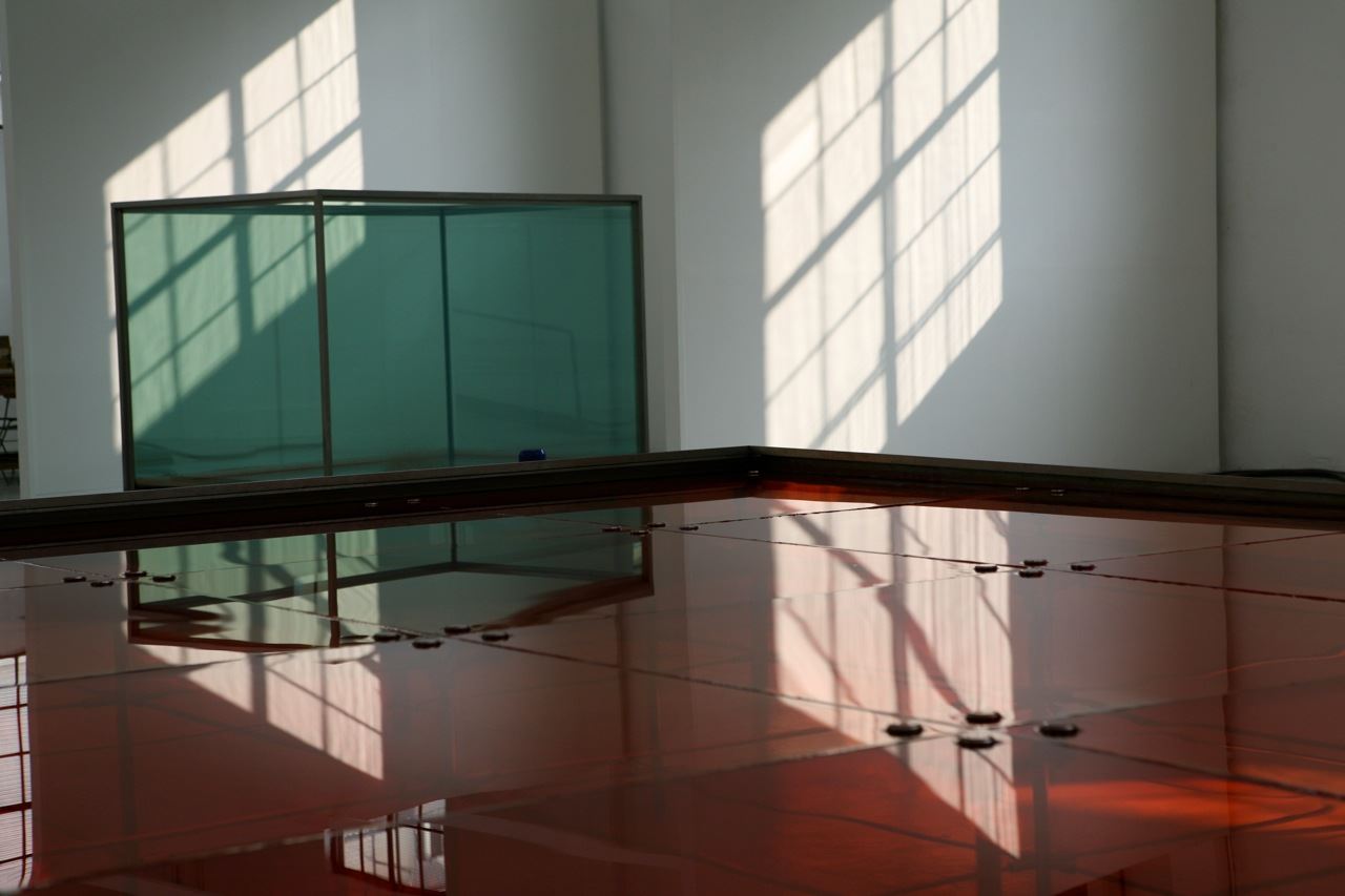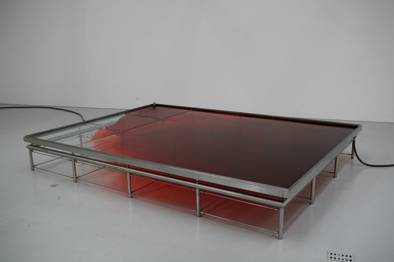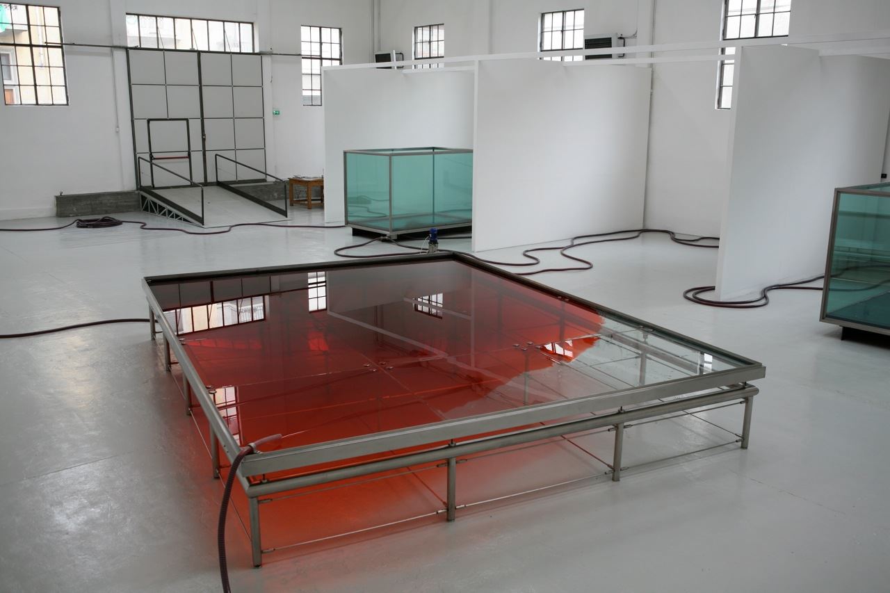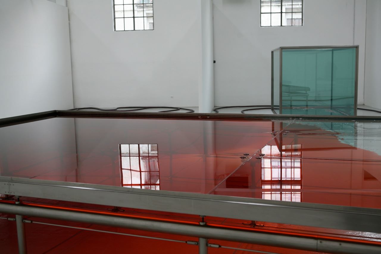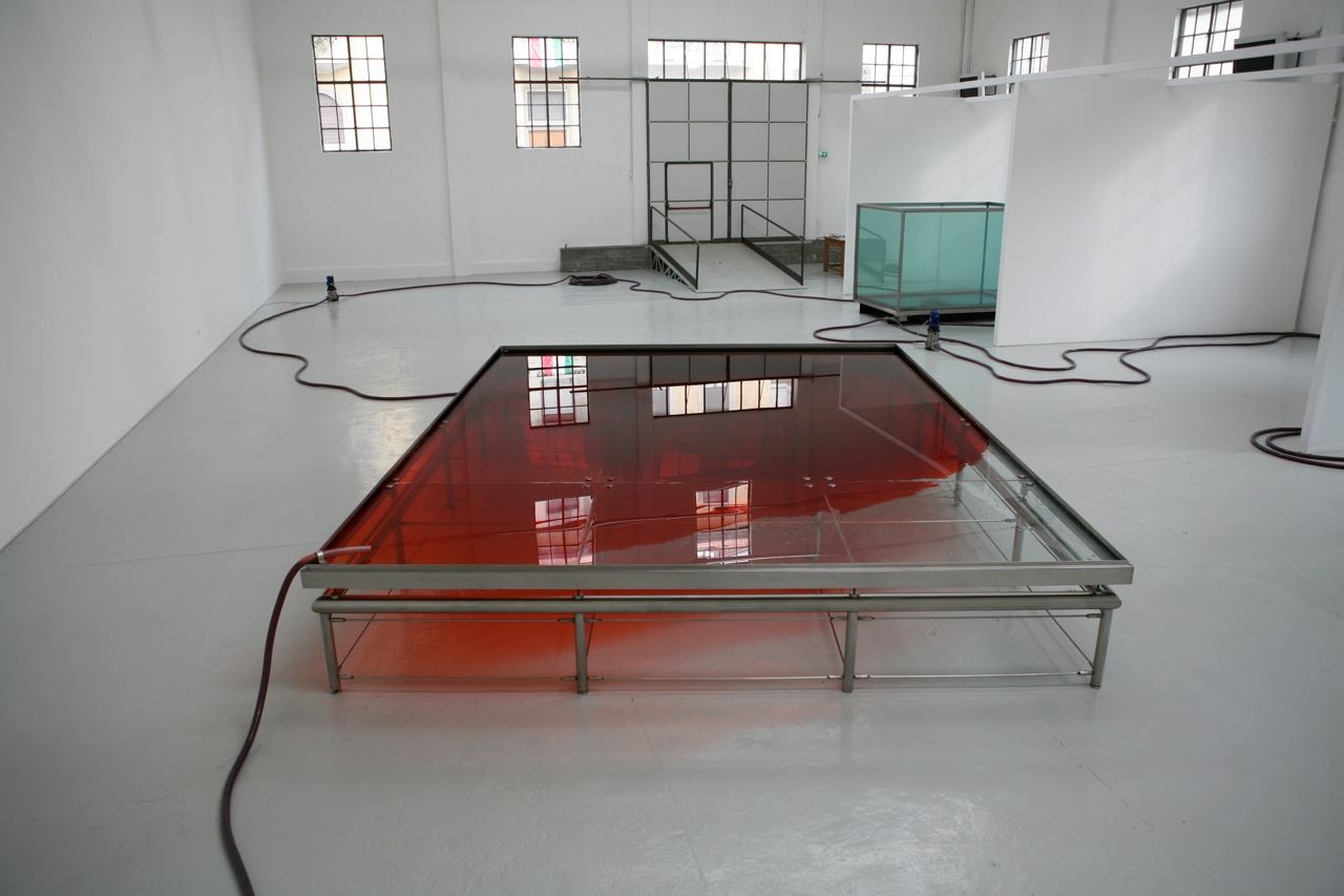 A differenza dell’installazione di Madrid dove il flusso del liquido trasparente richiamava l’intensa luce dello spazio del Palazzo ad un gioco perverso di rimandi dove l’esterno era l’interno e viceversa, qua il grande tavolo-vasca e le due ‘casette’ di vetro raccolgono e defluiscono un liquido caldo e fluido, sangue e tramonto: rosso; sempre con la complicità della trasparenza, attraversa e invade lo spazio architettonico. Gli elementi scultorei e architettonici sono connessi gli uni con gli altri in una sorta di ‘spazio’ pittorico a circuito chiuso. Il riferimento alle campiture rosse del pittore spagnolo del XVII secolo José de Ribera è scelta indicativa dell’artista norvegese che pone così ancor più l’accento sul richiamo pittorico come un dato della sua opera.