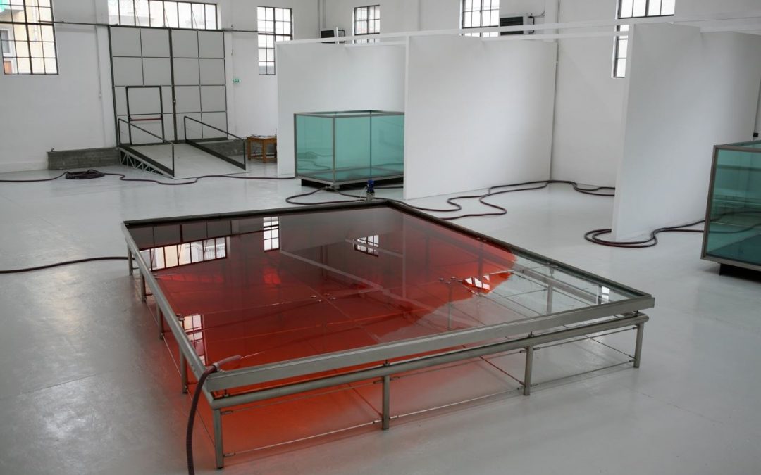 Diversi contenitori aperti (tavoli, vasche o ‘casette’) altamente tecnologici per i materiali usati, cristallo e acciaio, si riempiono e si svuotano di un liquido trasparente.