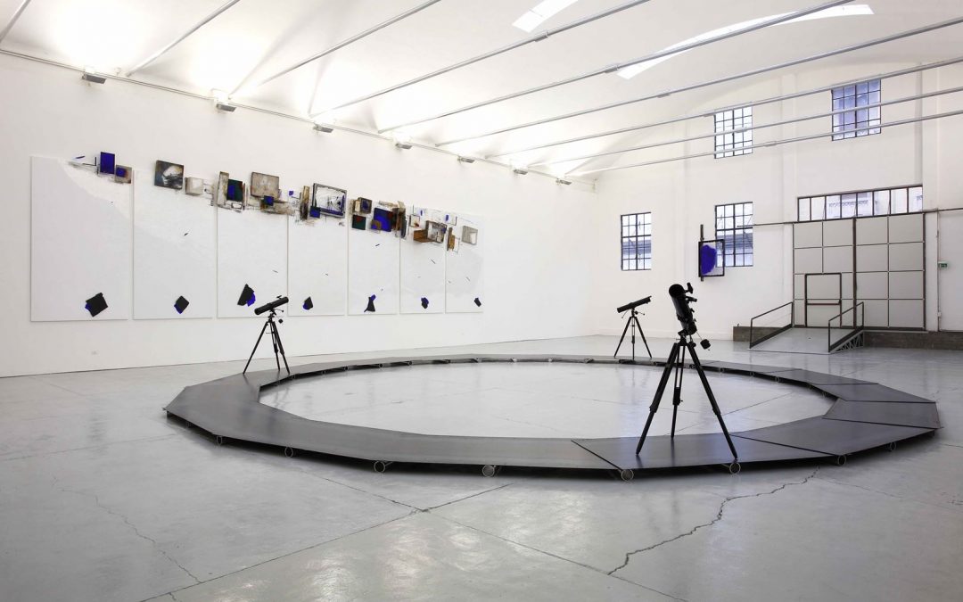 Sollevato da terra, un grande cerchio di lastre di ferro sul quale poggiano tre telescopi orientati verso il cielo è l’opera di Mattiacci. “Piattaforma Esplorativa è immobile ma ha un’evidente dinamica ruotante: come se si volesse alzare per volare a esplorare il cosmo, che è anche la funzione dei tre telescopi. Ho tratto ispirazione dalle stelle con le loro costellazioni, il sole, la luna, il cosmo e l’universo. La scienza e l’astronomia con le loro scoperte ci fanno capire come gira il mondo, come si evolve; l’arte non si evolve ma si rinnova, così che gli artisti più incisivi sono coloro che portano il cambiamento”.