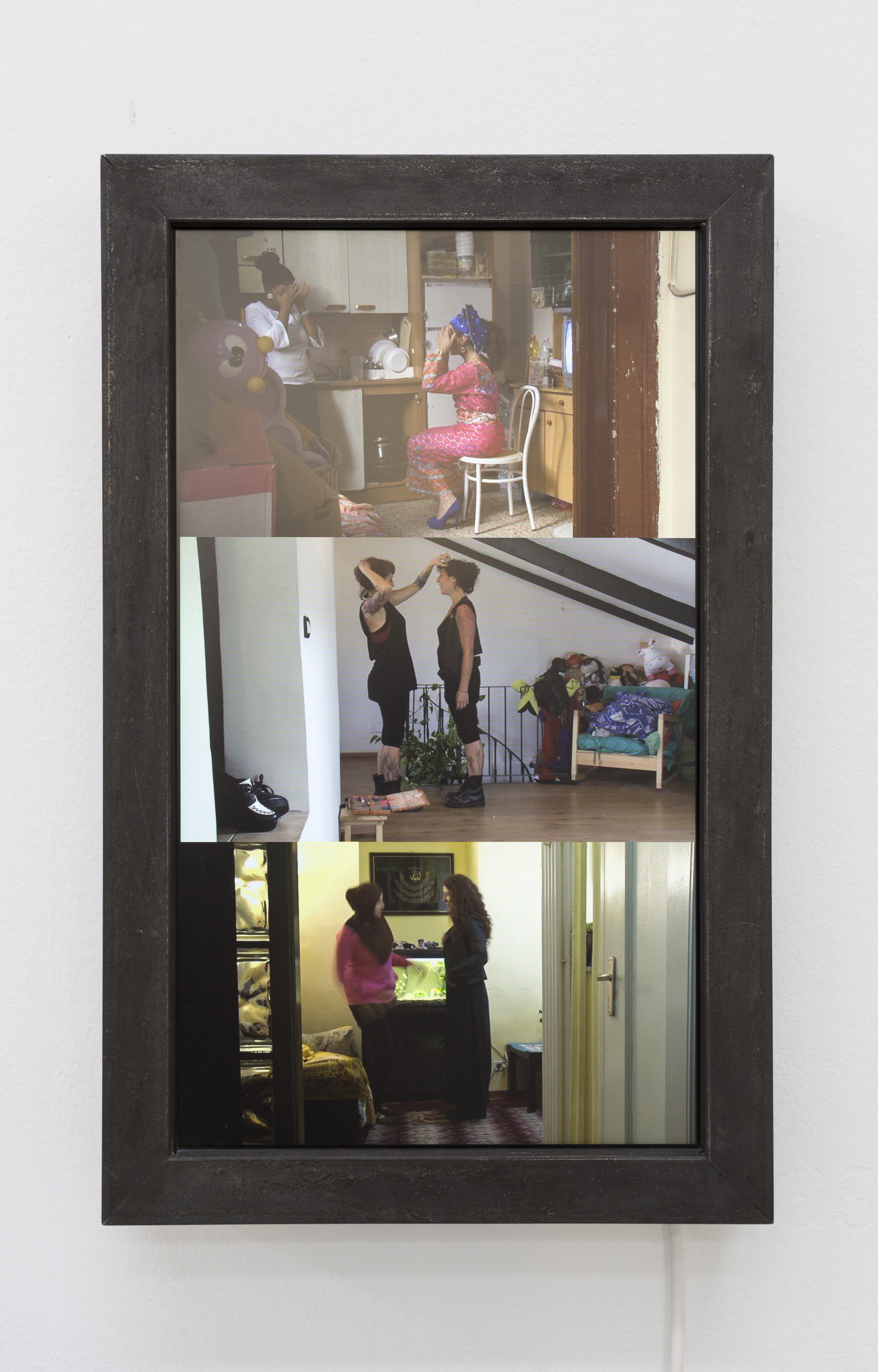 Il secondo lavoro, dal titolo unopertreugualesette, è composto da cinque schermi, contenenti ciascuno tre video disposti uno sopra l’altro come tre sequenze narrative.